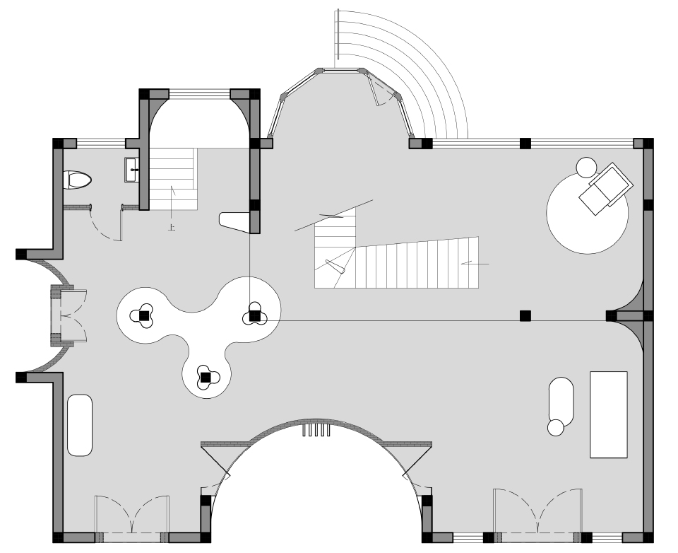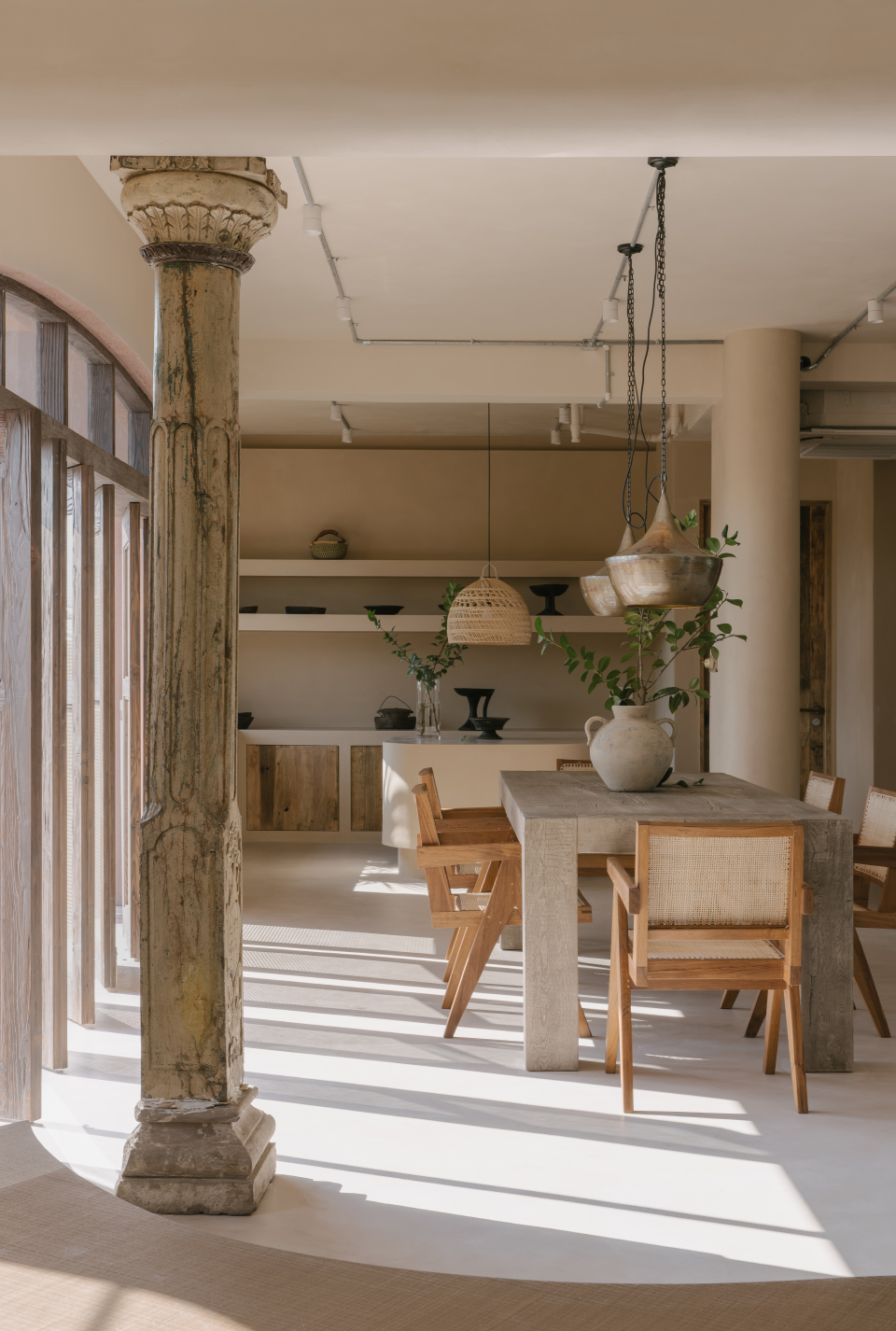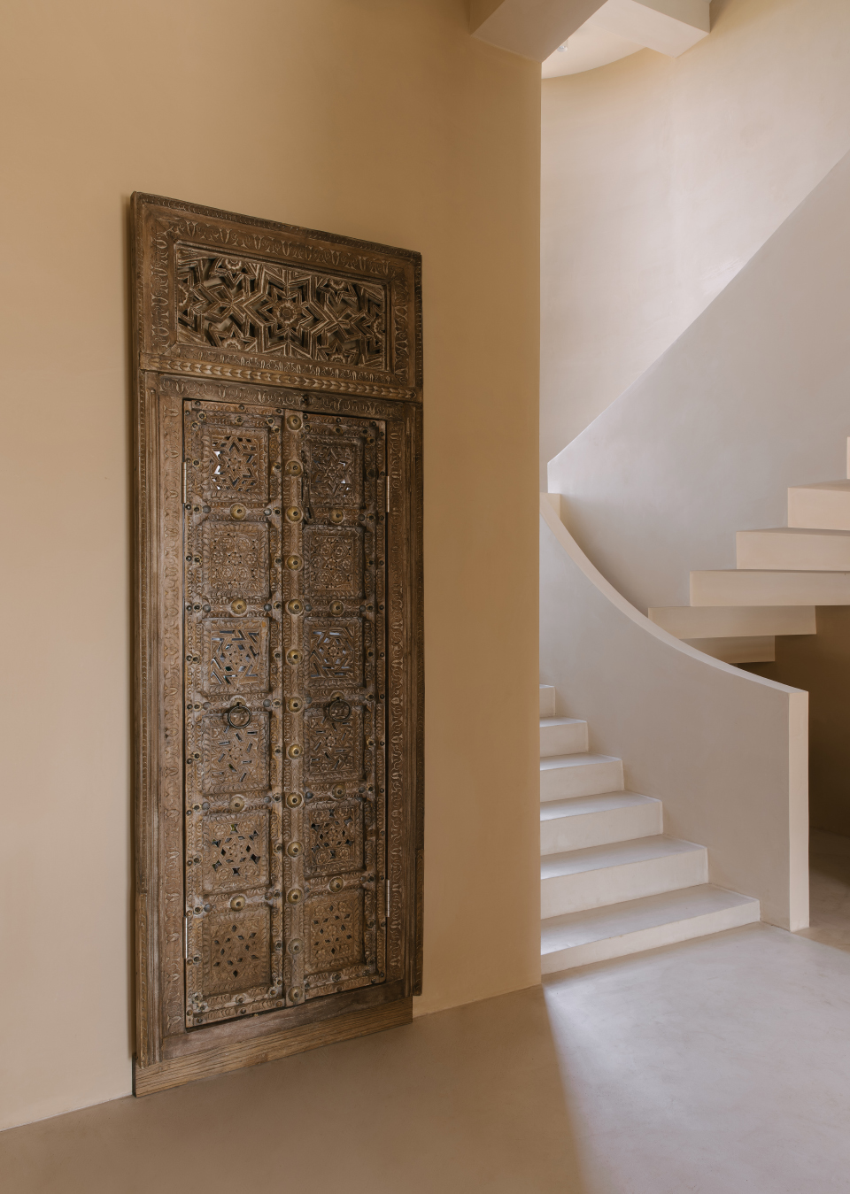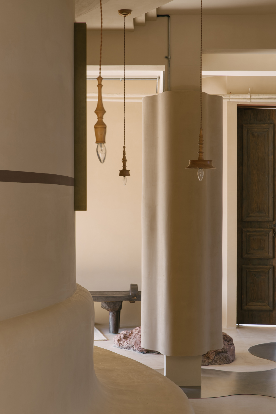 室内动态空间的组合通过区域穿行而得到不同的感知。我们在地面嵌入自然原石,与室外的自然景观相互贯通,古老的家具和早已风化的木材通过相对平静的墙地面得以完美展现。