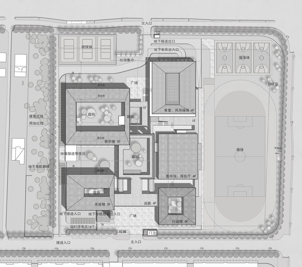 第四中学建筑群根据功能不同划分为5个内聚的院落,包括教学院落、实验院落、图书院落及体育院落。一个核心院落位于所有功能的中心,再通过廊道连接其他的功能院落。通过建筑体量围合入口空间和行进路线,学校由南向北通过校前广场,前院,中心院落,后院,把校园文化的仪式感建立了起来。