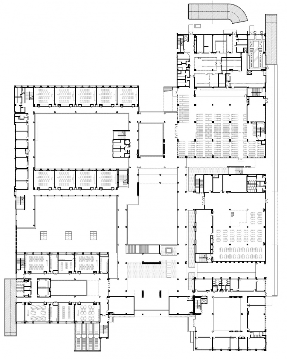 According to different functions, SND No. 4 Middle School building complex is divided into five cohesive courtyards, including teaching courtyards, experimental courtyard, library courtyard and sports courtyard. A core courtyard is located in the center of all functions, and then connected with the corridor to other functional courtyards. From south to north, through the square in front of the school, the front yard, the central courtyard and the backyard, the school has established the sense of ritual of campus culture.