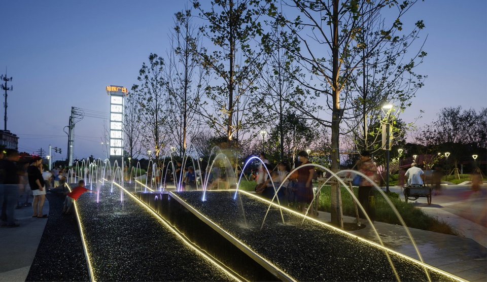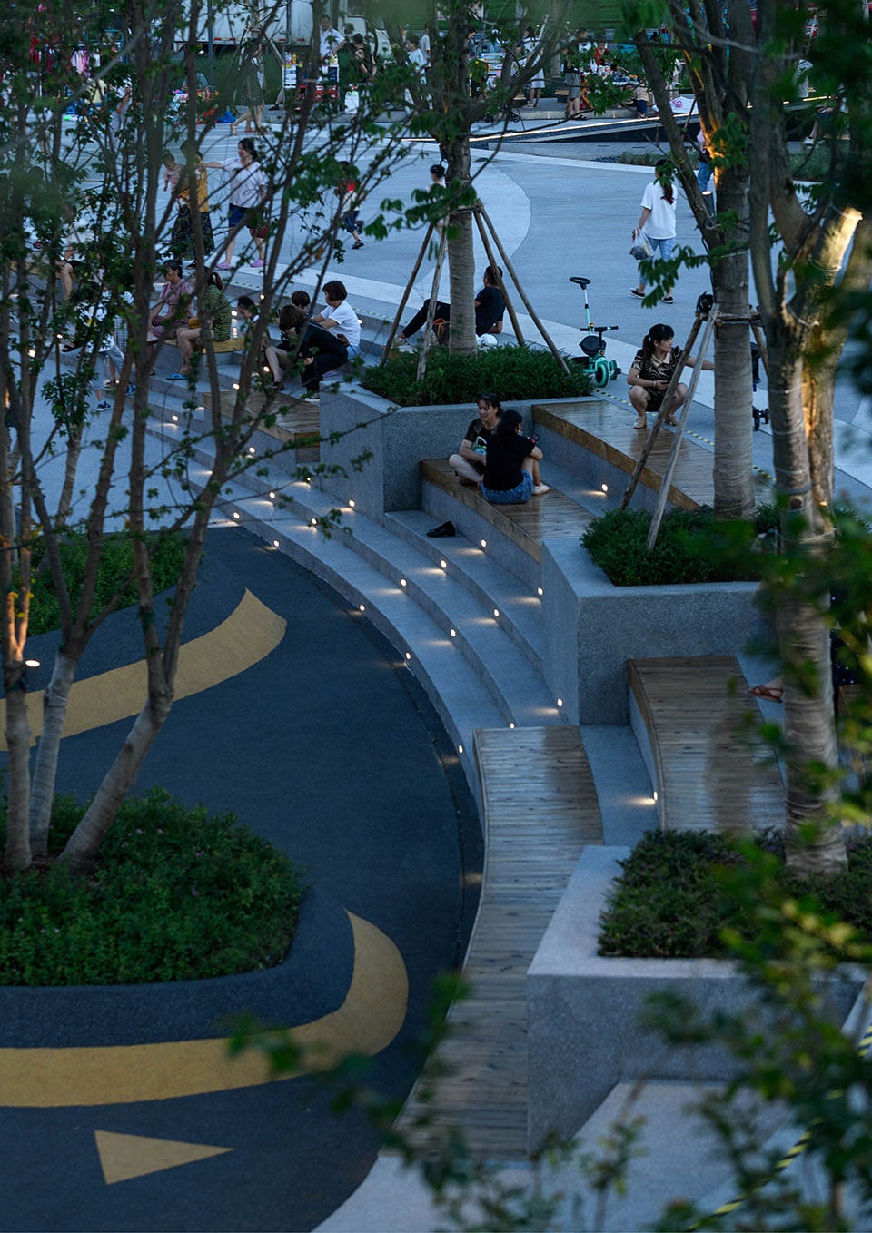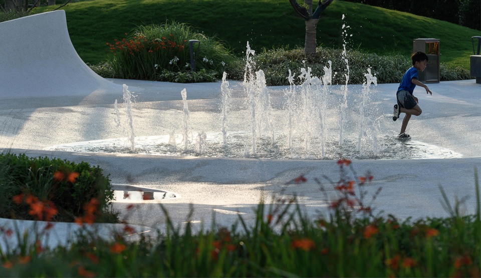 Children climb, run and slide on the grand slope tirelessly, with big smile, especially when they slide down from the grand slope of 4-meter drop. Children can be found on the linear fountain too, with entire body wet without noticing. The planters are sculpted with seat space in different elevation, some children move up to the place where others can’t reach, chatting secretly.