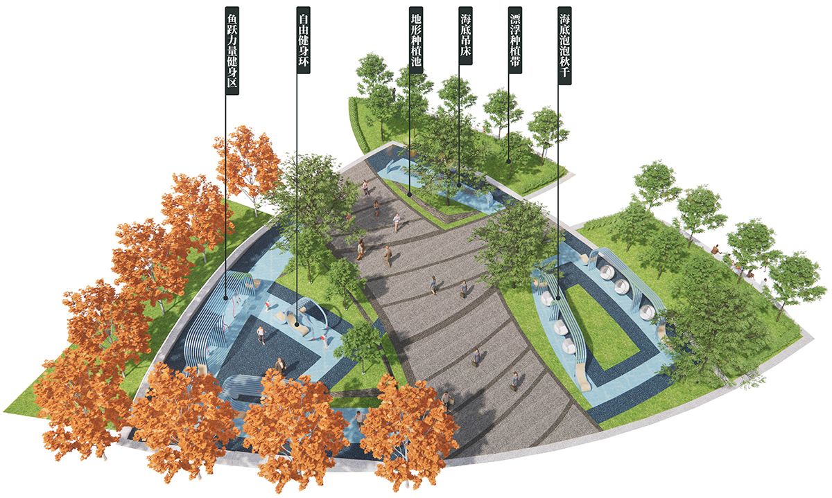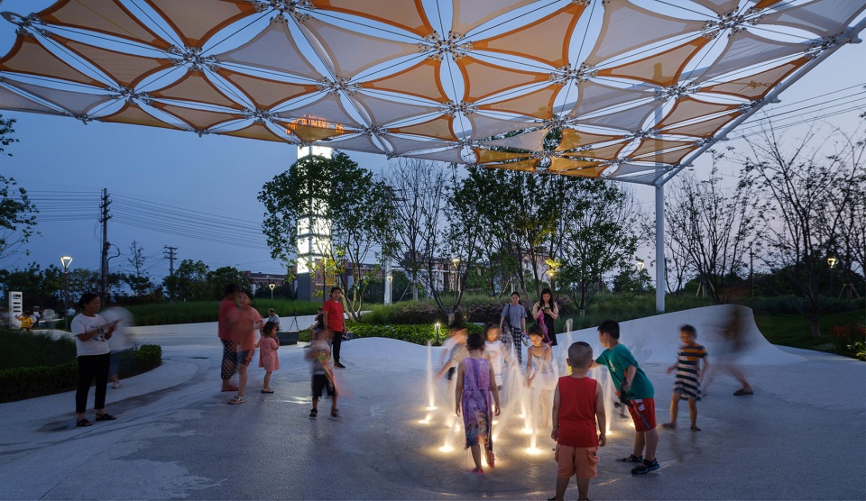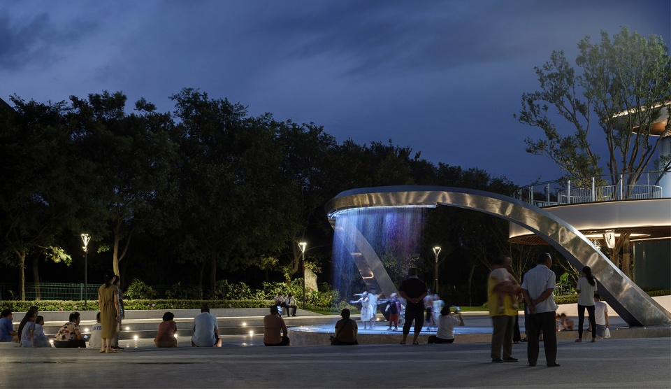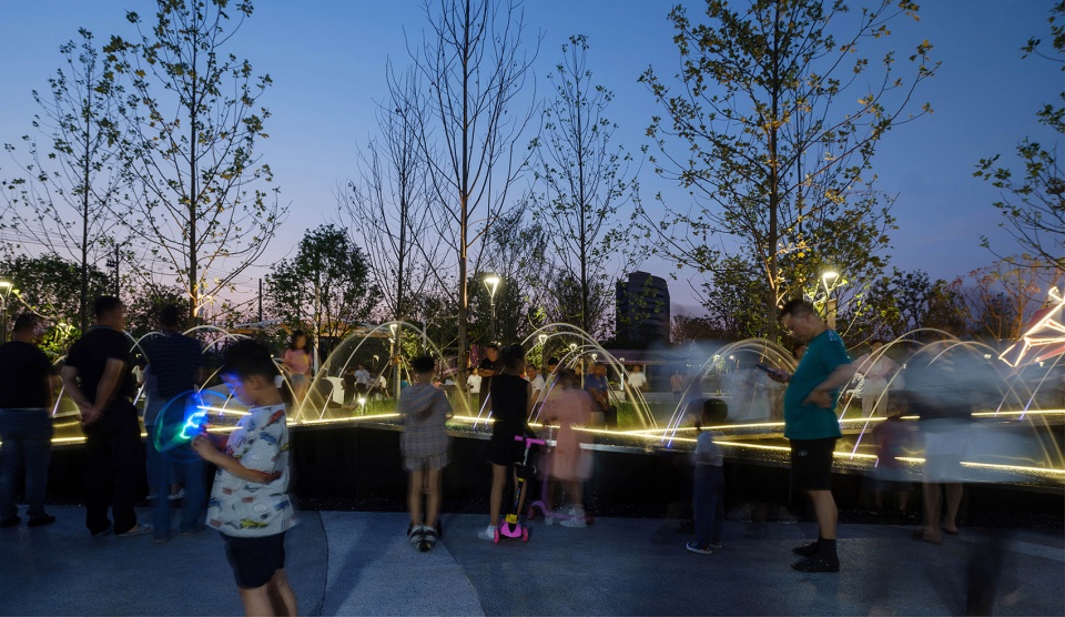 与城市道路交叉口紧密相连的,是主打社交与引导属性的——城市拼图。具有阵列感的榉树树阵、起伏的自然水景和林下的休憩平台,创造出舒适并且有归属感的环境,让人仿佛置身林中。流动的水景和灵动的跳泉吸引着小朋友在这里嬉戏、玩耍。沿着斑驳的树影、顺着清凉的水雾,人们不知不觉的就进入了公园的内部。