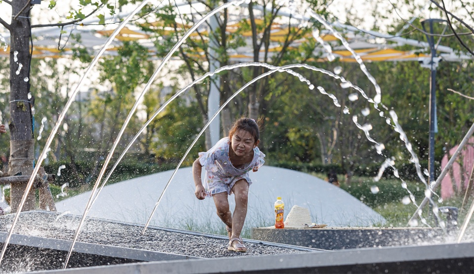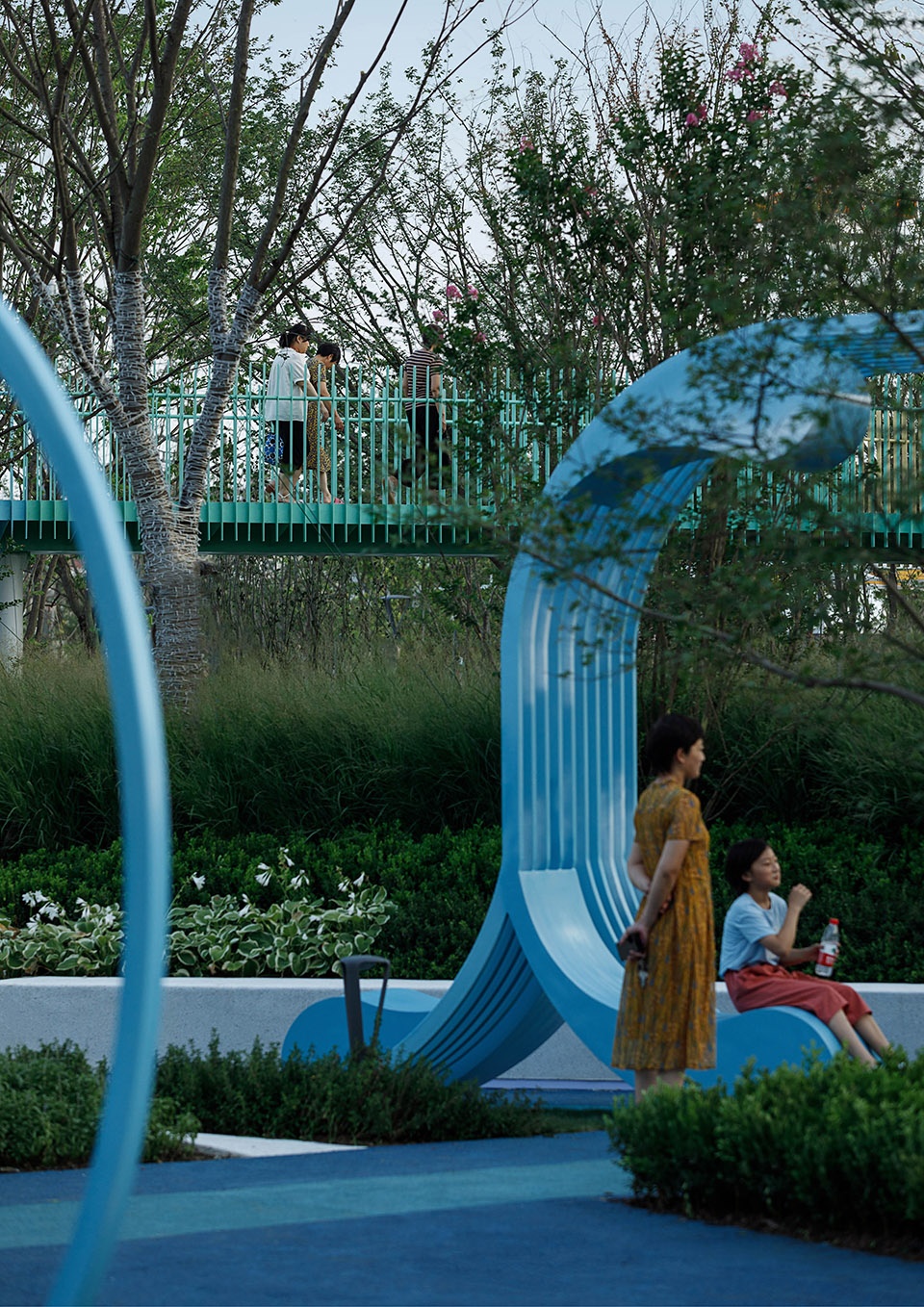 靠近北侧入口的是一个以儿童为主题的——森林拼图,这是公园中最具有自然野趣的部分。起伏错落的草坡为小朋友们提供亲近自然植物的场所,中间围合出的互动旱喷水景区域,成为炎热夏日下最清凉的一角,放学后的小朋友们都喜欢聚集在此嬉戏打闹,甚至带上水枪,“激战”一番。