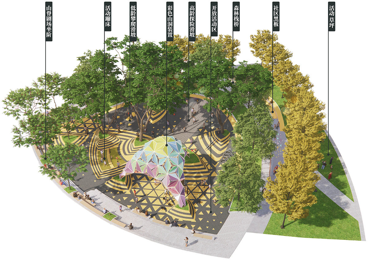 我们将滑坡对面设计成下沉1.35米的围合式坐阶。当小朋友们在场地中撒欢的时候,家长可以舒适的坐在树荫下一边歇息聊天,一边看着孩子们玩耍。在有户外活动聚集的时候,它也成为了天然的剧场看台。