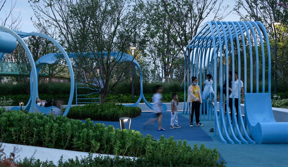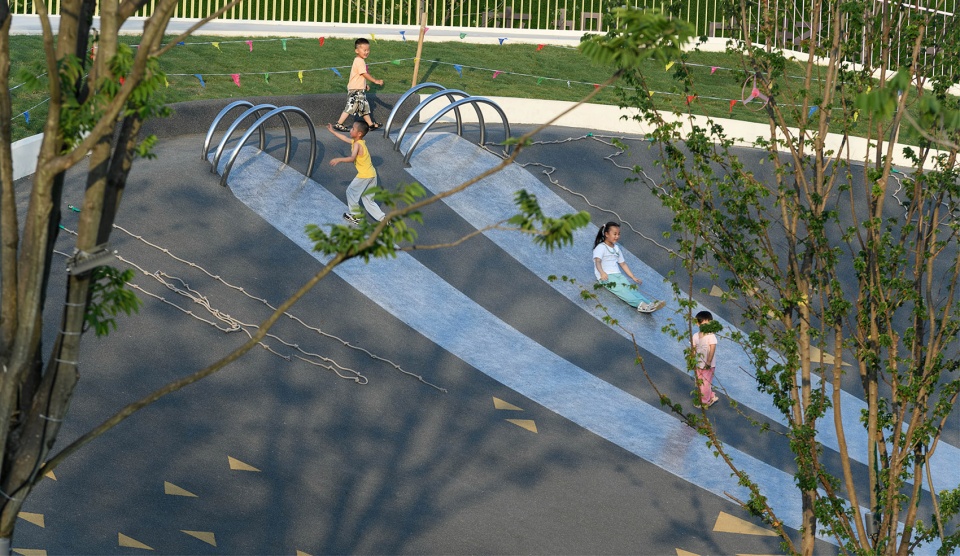 孩子们在高达4米的大坡地上不知疲倦地爬着、奔跑着。或从光滑的水磨石滑坡上滑下,因下滑加速而张大嘴巴欢笑着。或在跳泉和水景旁,与夕阳下的水花一同游戏,即使全身湿透了也并不在意。 或与小伙伴们一起,坐在高高的种植池壁上,在夏日的夜晚聊着属于小孩子们的秘密话题。