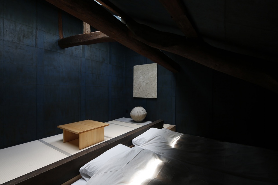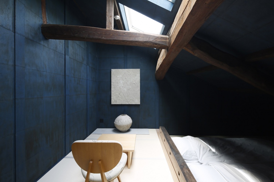 ▼阁楼改造而成的卧室采用了福知山靛蓝涂料,The attic bedroom is painted in Fukuzhishan indigo