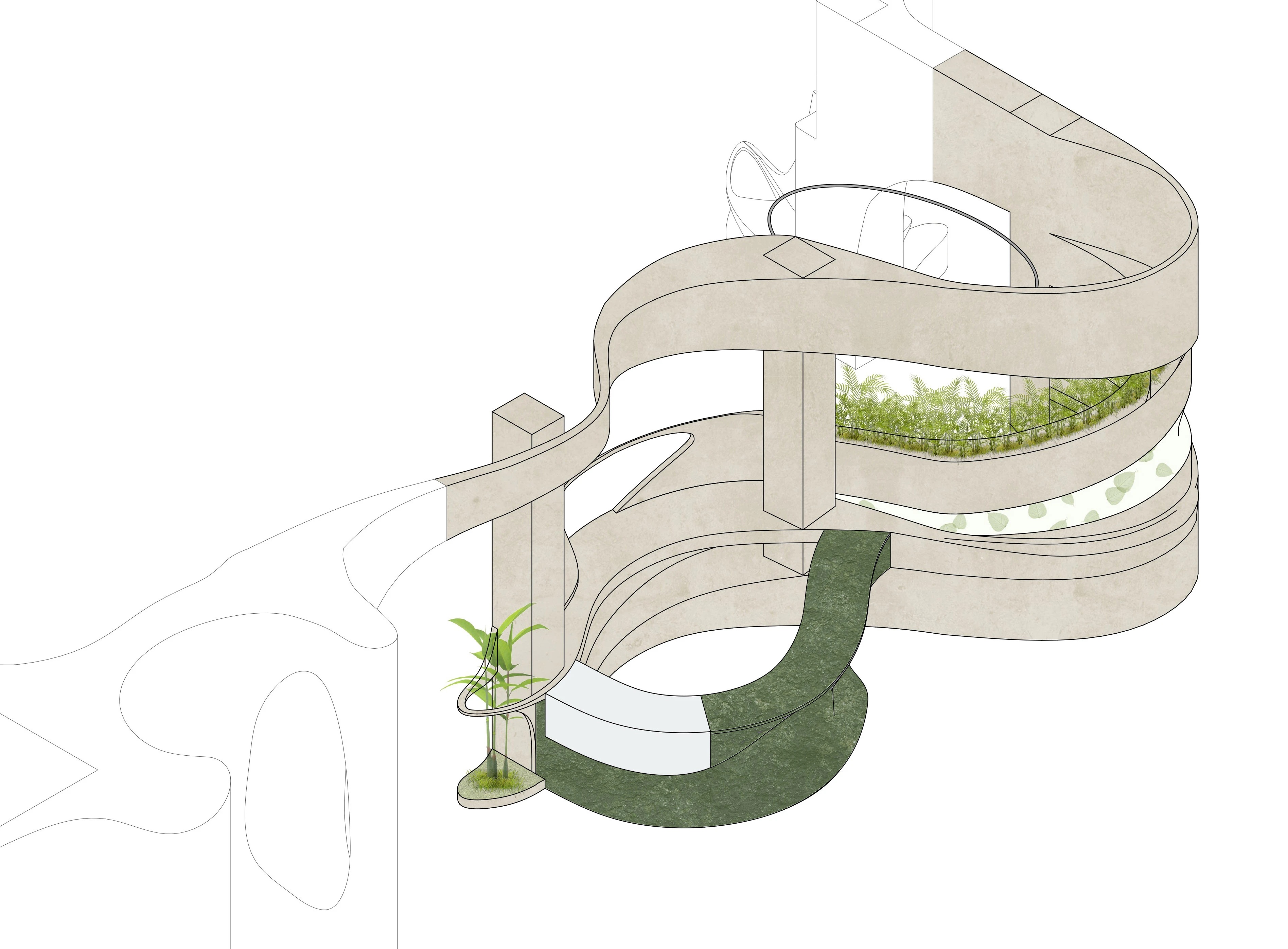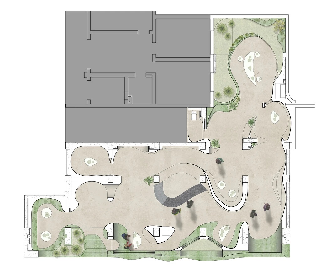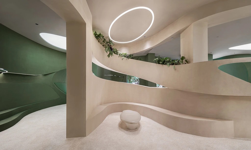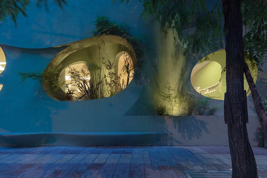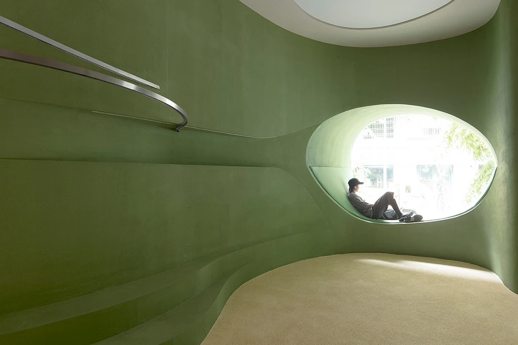 原本的建筑空间是19米深的镜像L型,被2.7米到4.2米的狭小柱网所局限,我们在此空间中引入三维有机的形态体量,使其变得流动而引人入胜。从沿街店面到居民后院,连续的空间层次被创造;时而紧缩、时而豁然开朗的节奏以及不同的大小尺度让空间变得丰富;沿此路径在特别选择的墙体位置设置形状和大小经过仔细推敲的洞口,通过洞口可窥看绿意葱葱的景观,以此在这极为限制的原本平淡无奇的空间中创造一系列让人意想不到的空间节点,使其体验的深度及其复杂性都被大大提升。