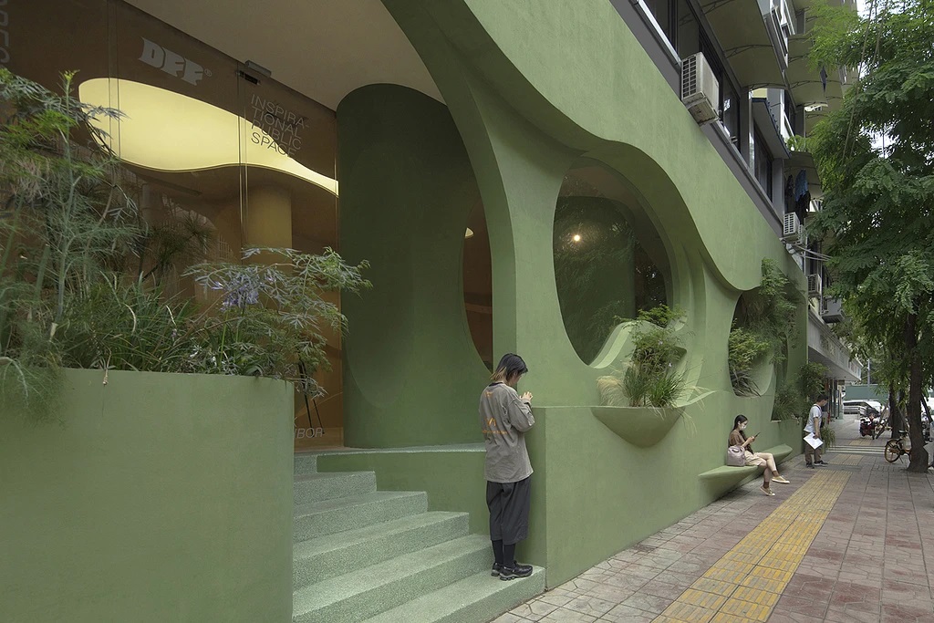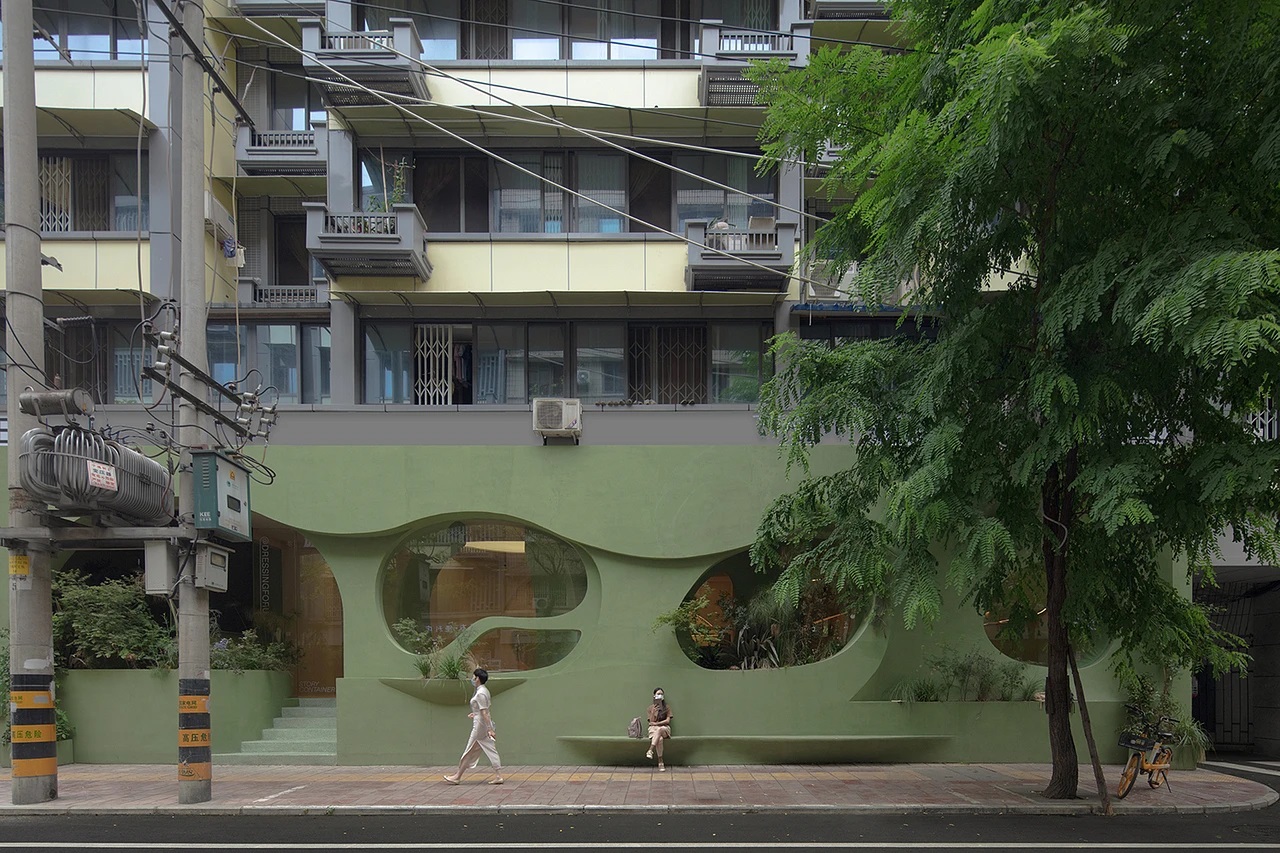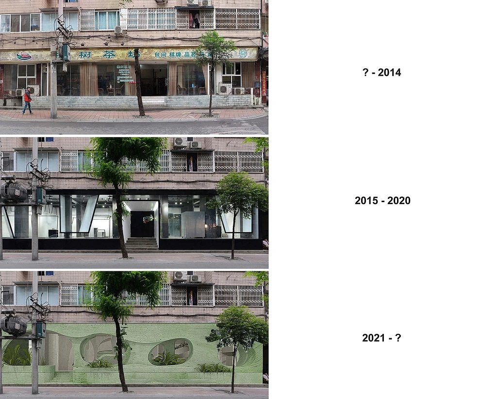 在此次的更新设计中咖啡店的功能需求被增加,由于店铺所处的街道栽有枝繁叶茂的槐树作为行道树,我们在外立面的更新设计中使其空间化立体化,融入了多种形态的功能需求。除了进入店铺的入口以外,城市家具被作为外立面的一部分进行一体化设计,流线型的座凳突出于外立面的二维界面方便街道行人就坐。在外立面的室内一侧还一气呵成地设计了可以看到绿植景观的咖啡座位和休闲区以及植物种植池,使得外立面成为了一个可以同时容纳多种不同使用的有机体。