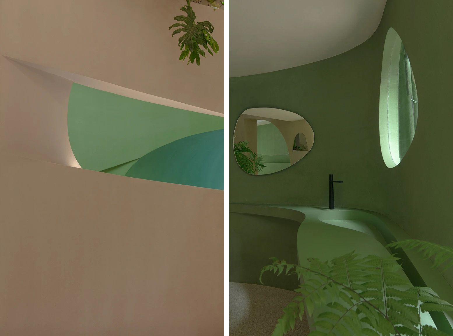 例如,当站在卫生间外洗手时,透过非对称的椭圆形窗洞可享受后院的绿植景观,洗手池为定制设计,当洗手时水流顺着凹槽流向低处的植物种植池。