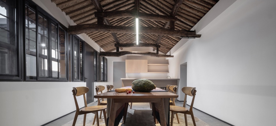The original old building is the core of the whole courtyard. Due to uninhabited and disrepair, the structure of the old house is not stable, the wood is corroded, the space is depressed and the interior is grey, which is not in line with the current aesthetic and quality of life. However, the original features of the building are quite distinctive: wooden window frames, brick walls and tiled roofs are all symbols of the memory of local dwellings. We have carefully restored and preserved it, preserving the traces of history; At the same time, to ensure safety, we added steel structure to the interior of the old house to reinforce, the whole house replaced waterproof and roof tiles.