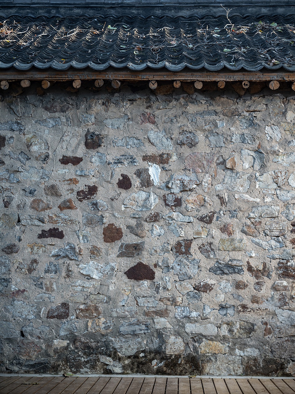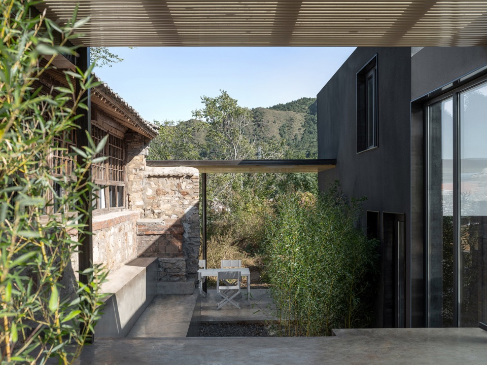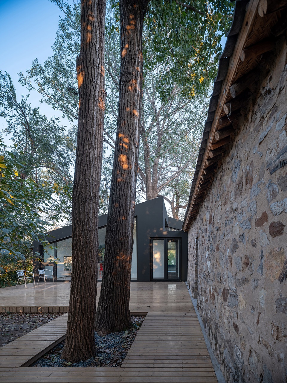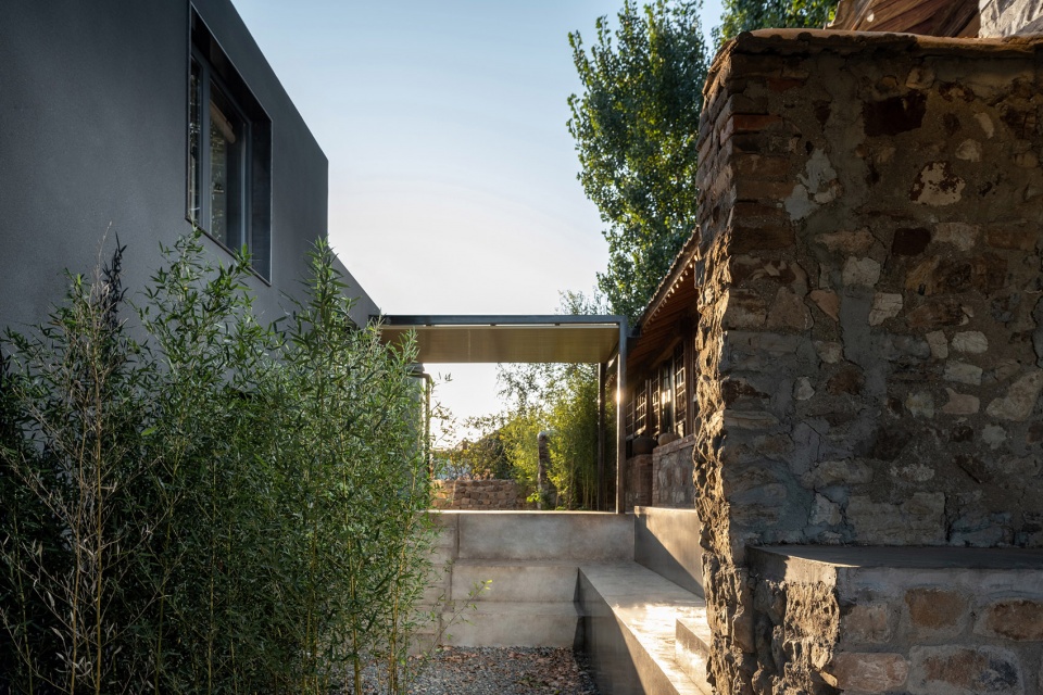 如何对待传统建筑一直是乡建最需解决的问题。作为曾经的农业大国,中国文化的乡愁浓缩于乡村,“原汁原味”固然延续记忆,却存在着种种问题:传统建造材料和结构让建筑的开窗面积受限严重,降低了采光舒适度;面向乡野而来的都会客们既向往传统的生活方式,也希望能够享受现代化的便利,他们的体验式居住状态和村落原住民大不相同。我们并不赞成“反现代”的表演,但也认可共同记忆与情感的价值。于是,我们以老房子作为空间的核心,以一种象征性的符号满足来客对“原生态”的向往,部分石墙作为一种文化符号由老房子发散而出,作为院落的装饰性外墙。