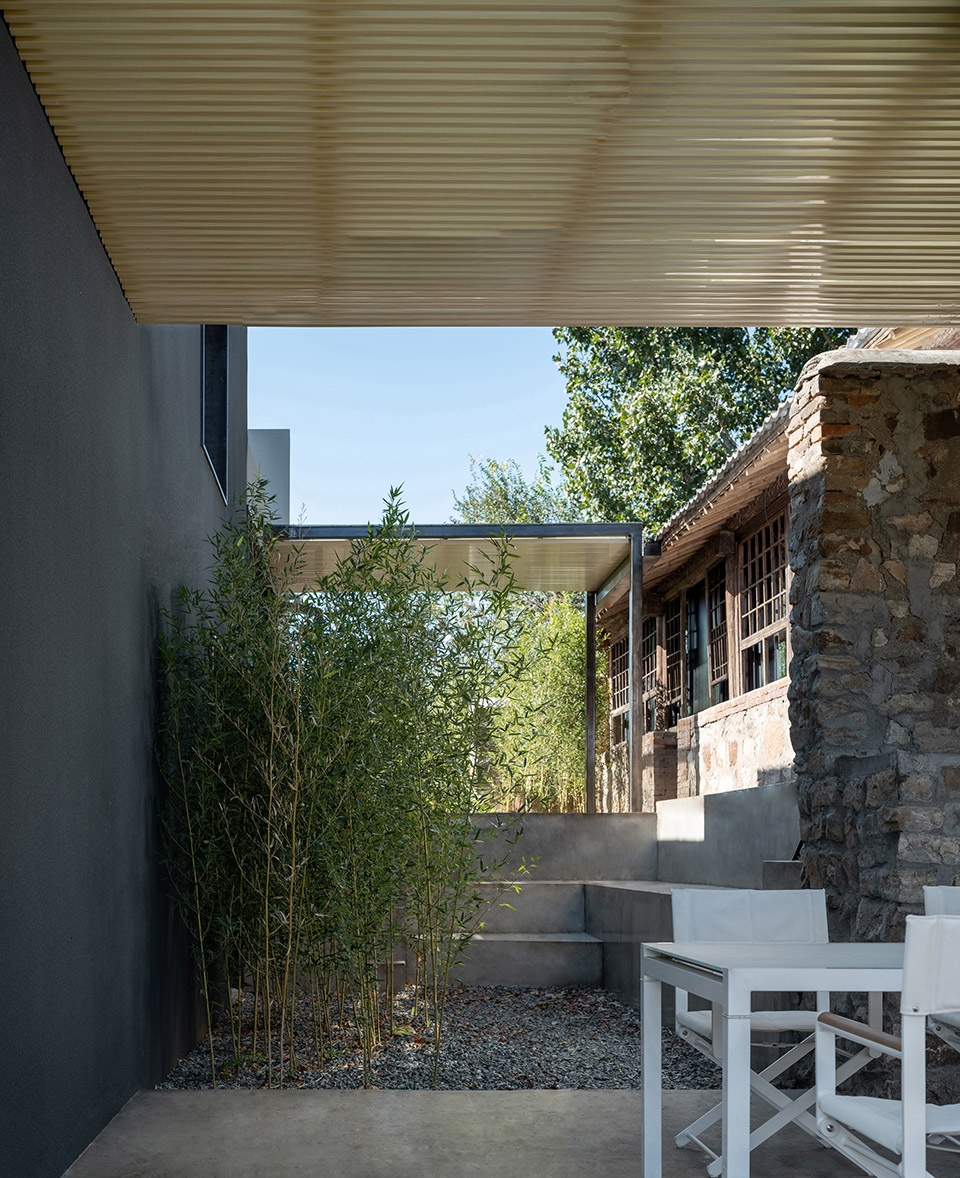 The elevation difference between the east and west of the site enriches the shape of the courtyard space. We processed the platform according to the terrain, and defined difference value of upper and lower parts of 1.4m. At the boundary of the terrace, the new building is joined to the old building by a glass-roofed black metal corridor that extends from the outside to the building’s interior, blurring the boundary between the courtyard and the house and that of the interior and exterior Spaces. The black metal boxes grow close to the old and new buildings, forming part of the two main buildings, and extending tentacles and connecting each other on the eastern side of the site. The “metal box”, as an association, integrates the information and people flow of the two main buildings in the north and south, and forms a new possibility for the arrangement of the internal space of the building.