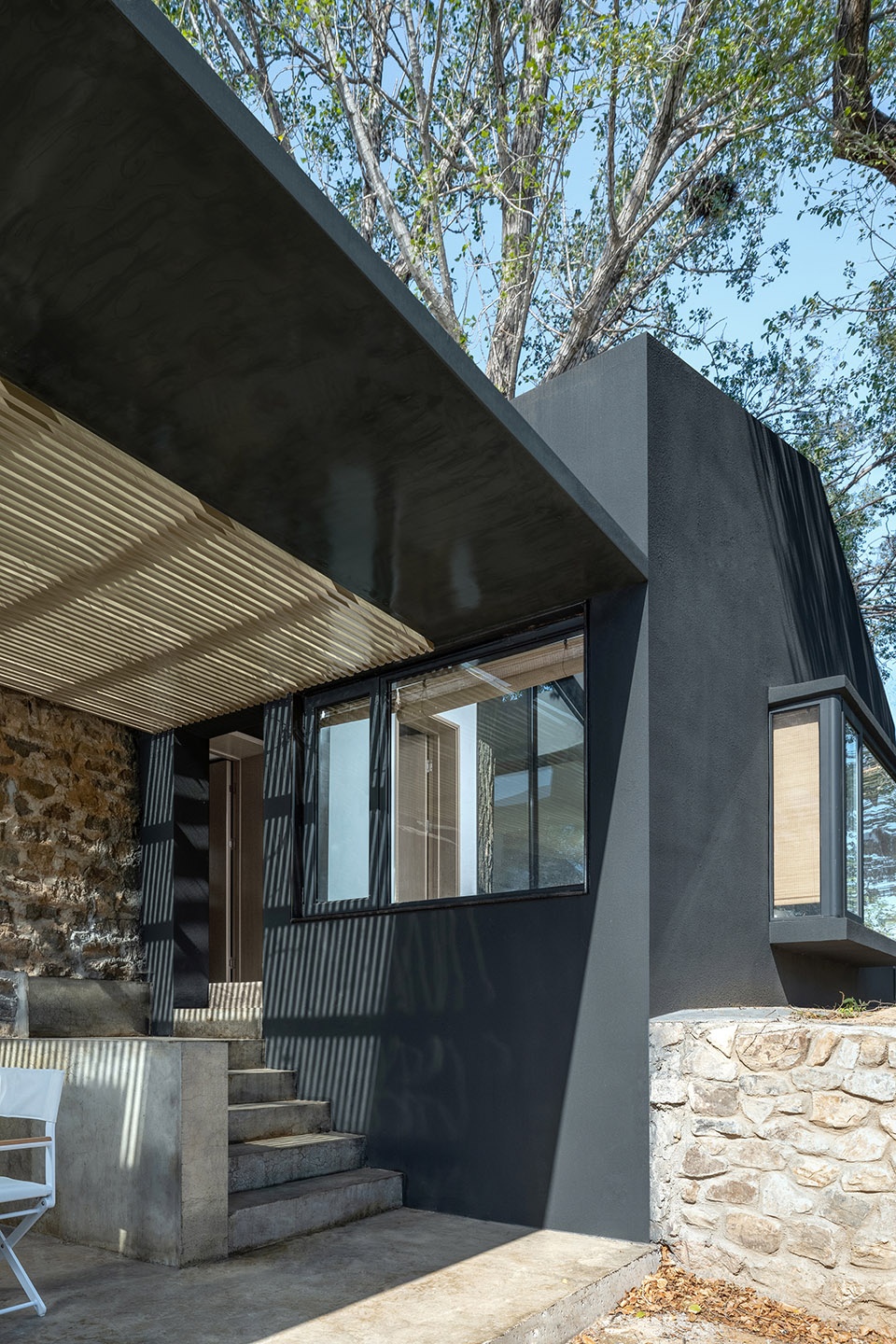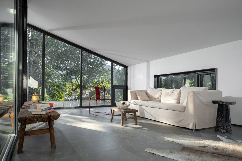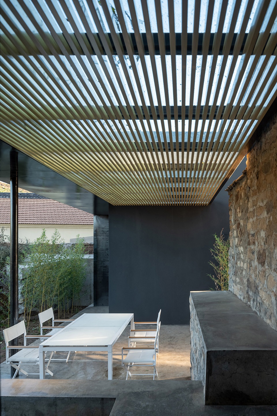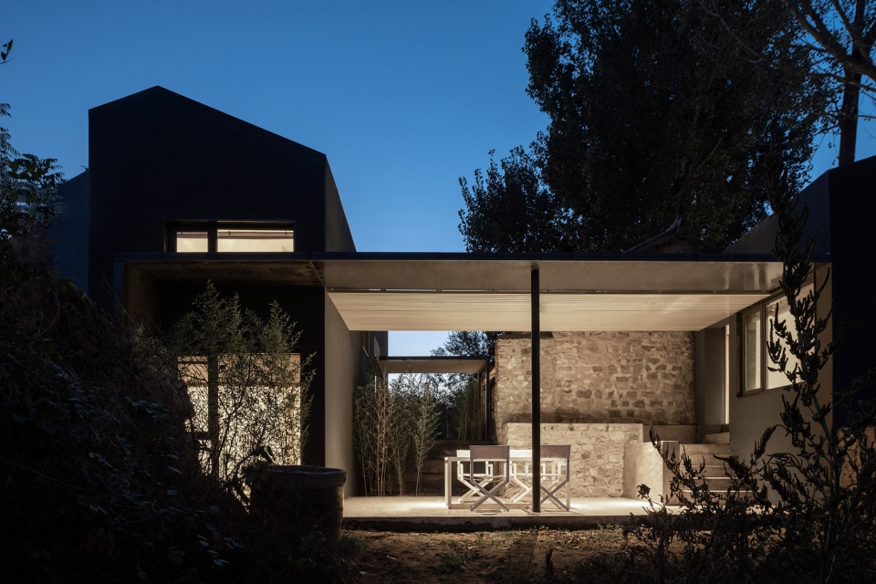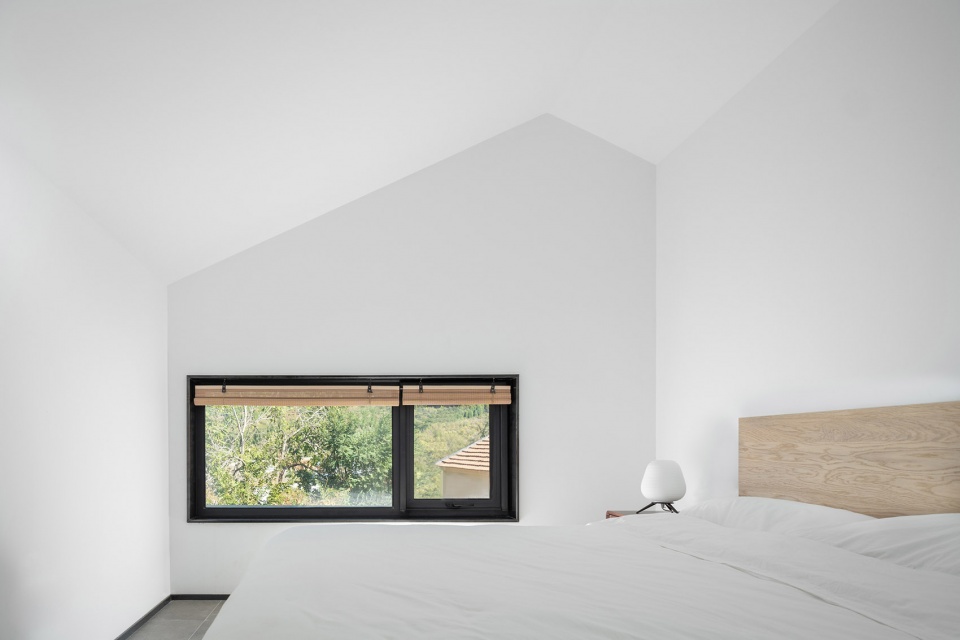 而真正的居住空间位于老房子的南侧,灰色的水泥房子按照老房子的形态与比例而营建,却因现代结构的介入而能开设大小不一、高低错落的窗户与天窗。材质上,主建筑清水混凝土外墙与石墙一样,以 “粗野”的形态裸露于观者眼前,形成现代语境下的“原汁原味”。