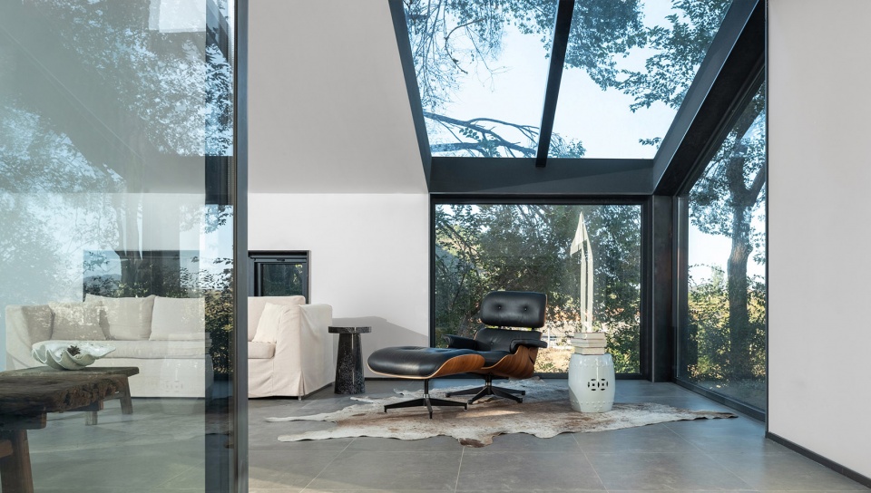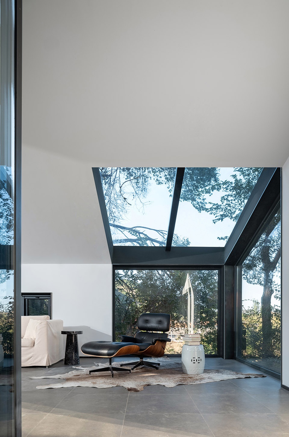 根据场地地形,东侧的连廊设于-1.4m标高位置,并创造了新的屋脊高度。地形高差借势增加了室内的净高,在新建筑部分,利用这处增加的高度,我们设计了一间位于二层的卧室和一间拥有阁楼的亲子书房,为不同的家庭结构的使用者提供了自由选择。而在北侧,公共空间由传统建筑的外壳脱胎,蔓延至新的“金属盒子”。内庭院将场地原有的植株保留下来,环绕它们布置了客厅与茶室。透过大面积玻璃窗,庭中枝桠跃入眼帘,营造出树下生活的惬意生活场景。