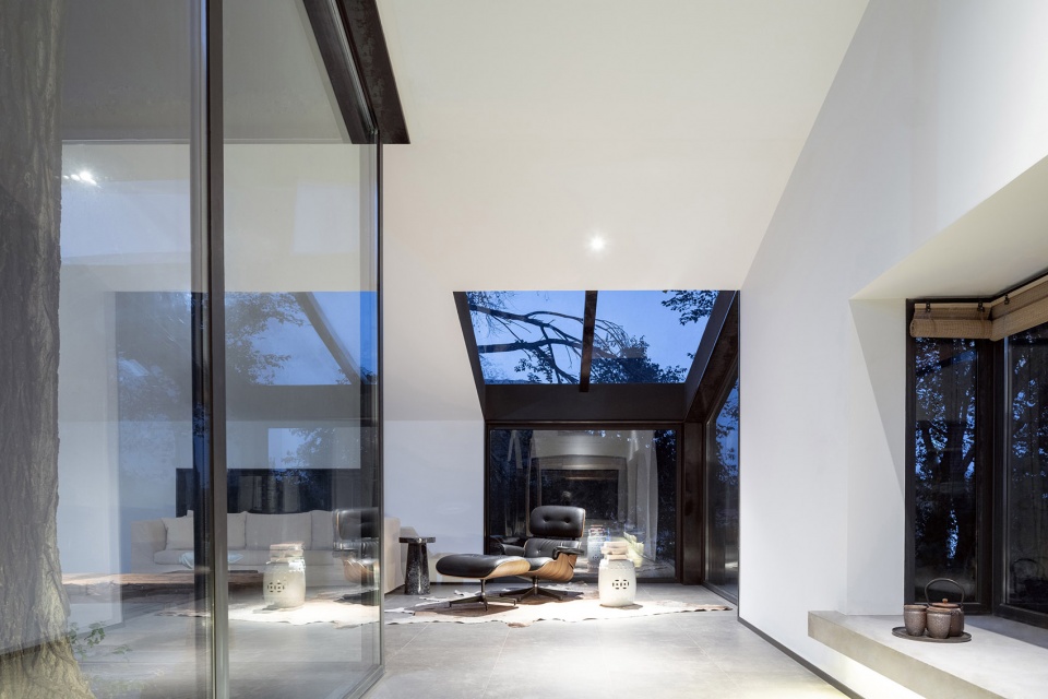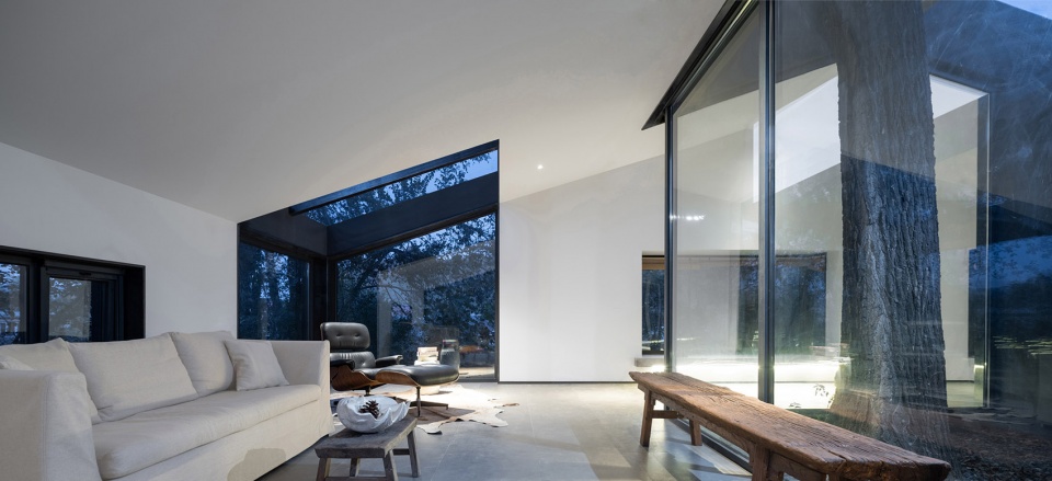除客厅内庭院的设计外,场地内的观景平台也为原有树木的存续而退让,最大程度地减少了营建行为对场地生态的破坏。室内,我们以大面积白墙为底,如同幕布,让树影婆娑投影其上,这种处理手法同时响应了成本、尺度和场地记忆。