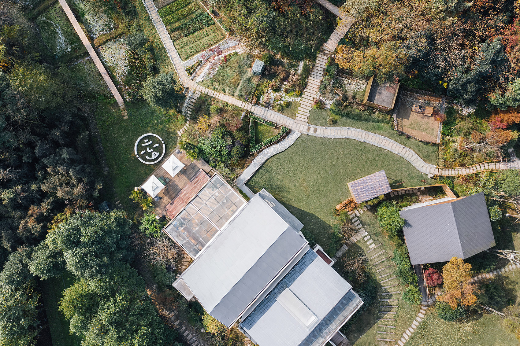 In addition to the restaurant, the farm also needed a new place for the celebrity guests and the elderly to relax, unwind, and engage in leisure time activities, which is the drawing-room of Forget me, not farm. In the early stage of the project, after repeated inspections of the site and communication with the program producer, the location of the Forget me, not farm drawing-room was determined to have some kind of connection with the restaurant and at the same time, the environment of the site should not be destroyed. Therefore, the woods directly opposite the restaurant became the first choice, spatially echoing the restaurant, located in the middle of the woods and hidden in nature.