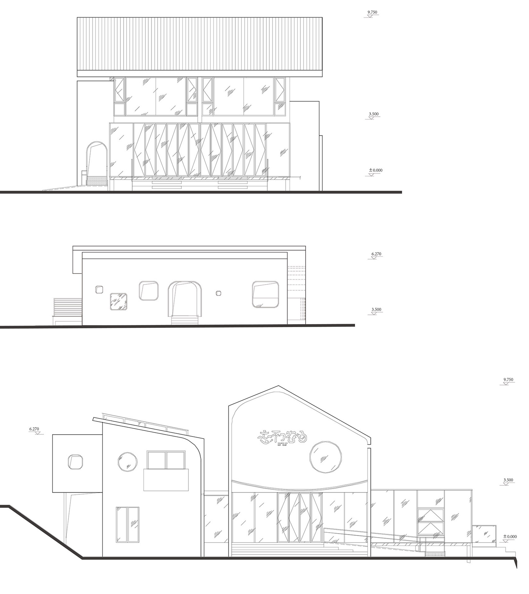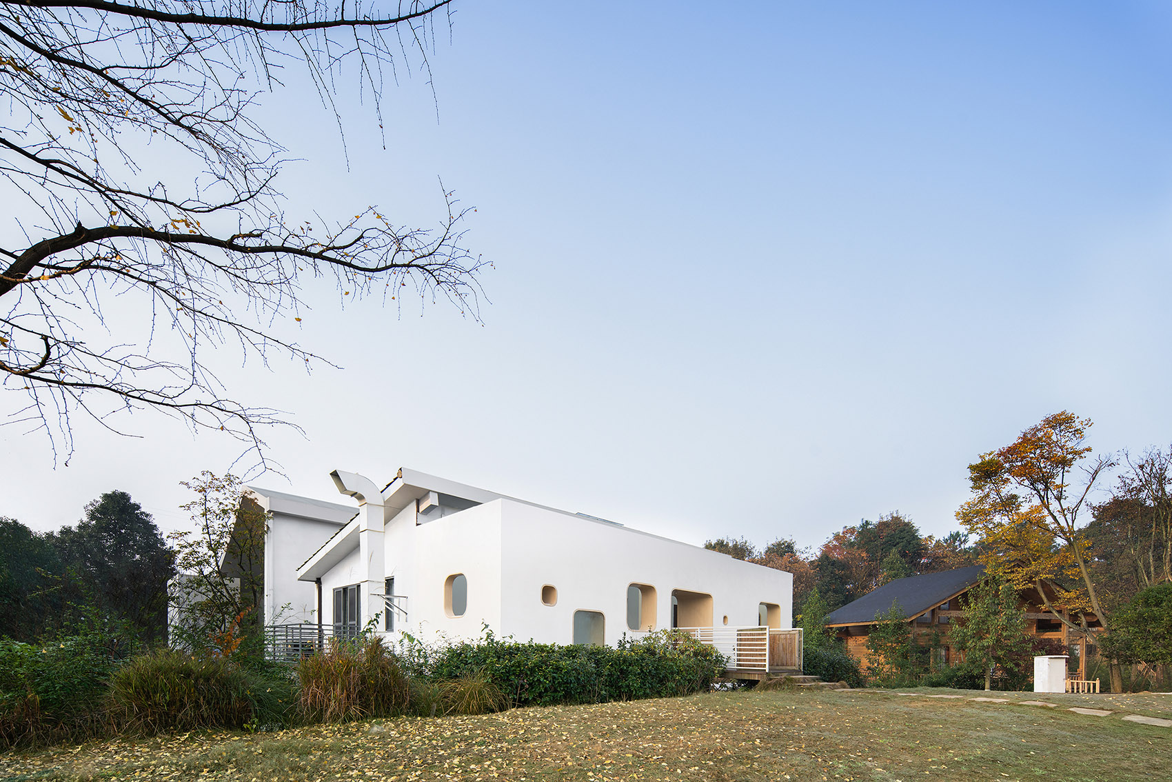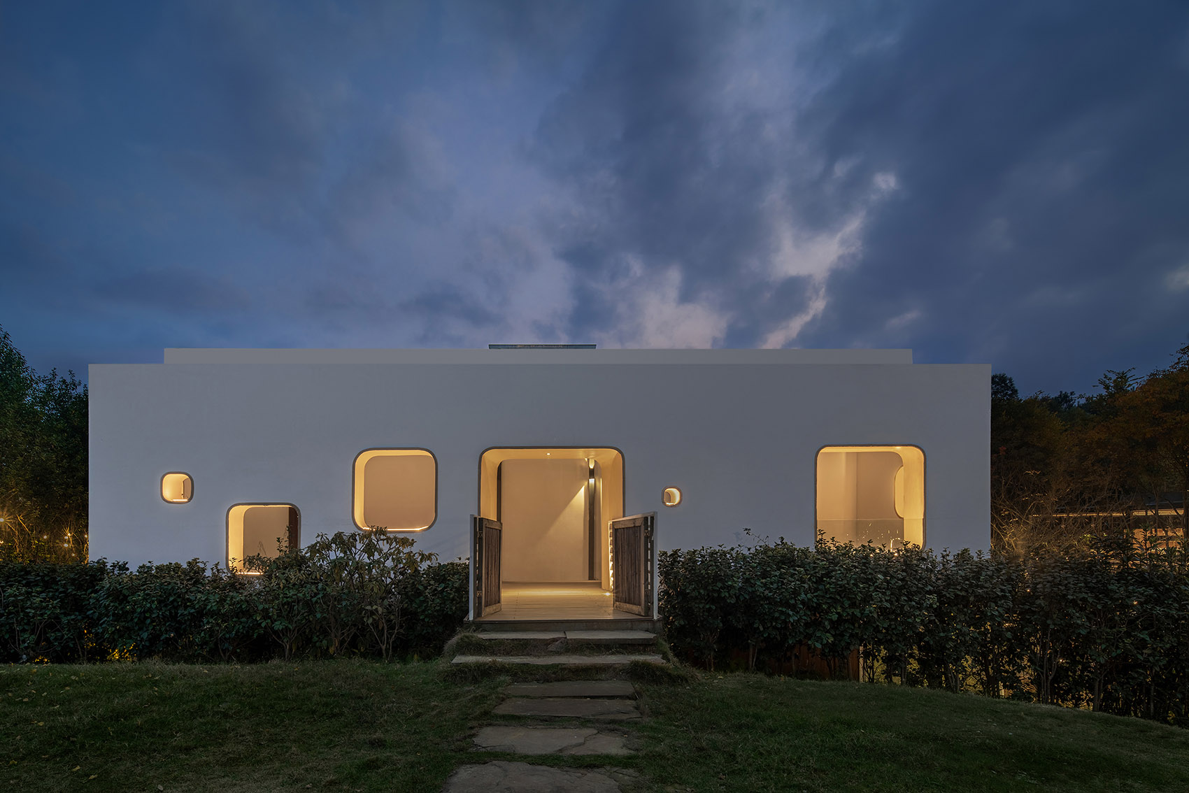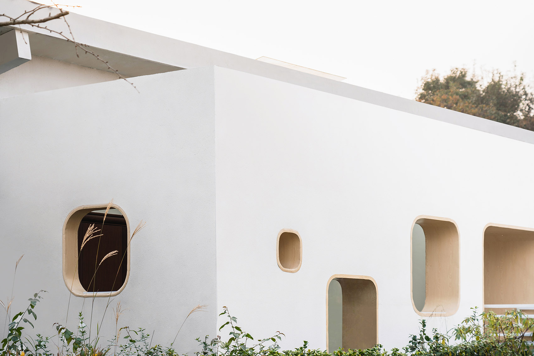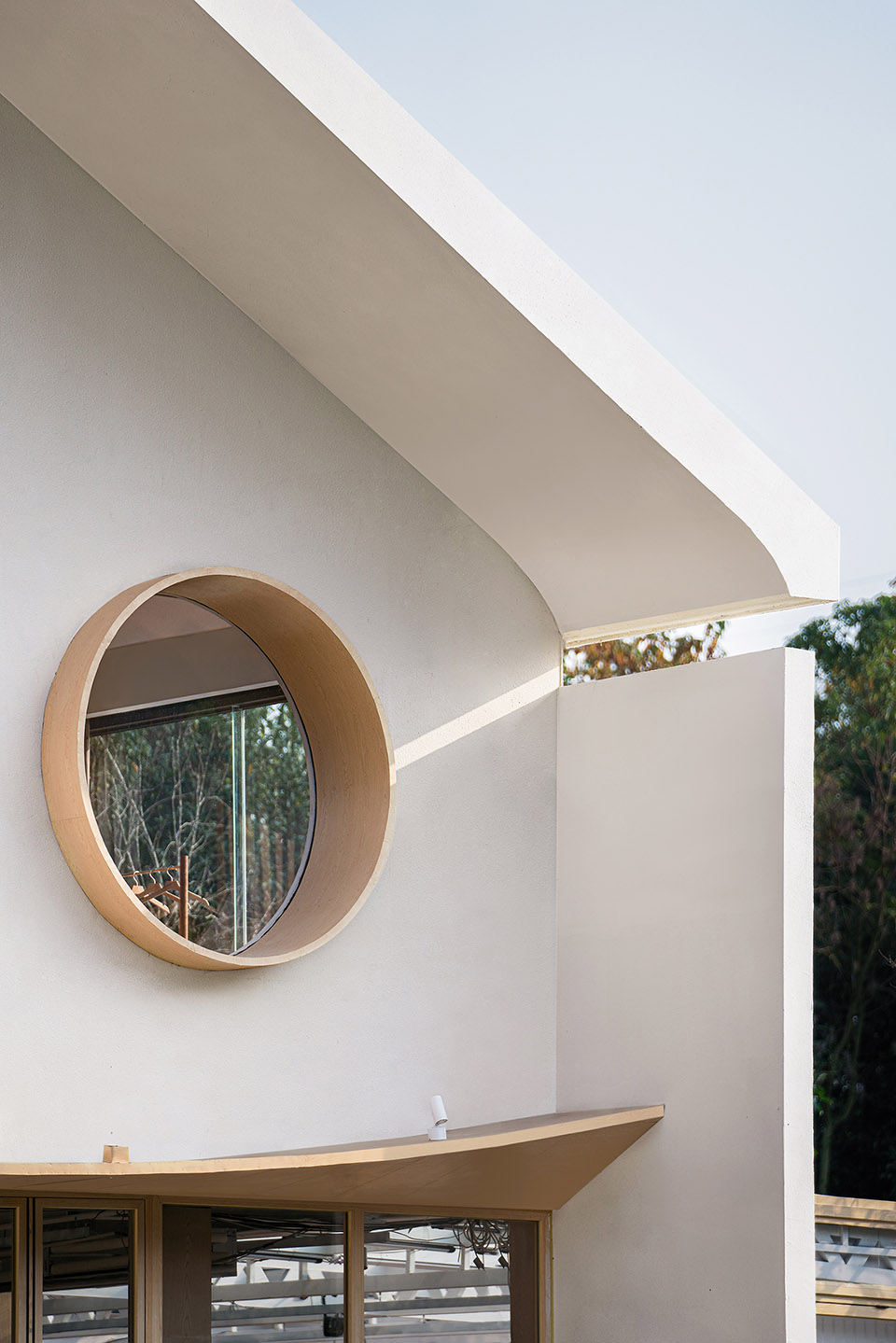 The warm white skin of the building and the warm wood color fill the whole space, and the round windows are dotted in between, turning the building into a free and childlike “home”, leaving warm memories for the elderly and the customers.