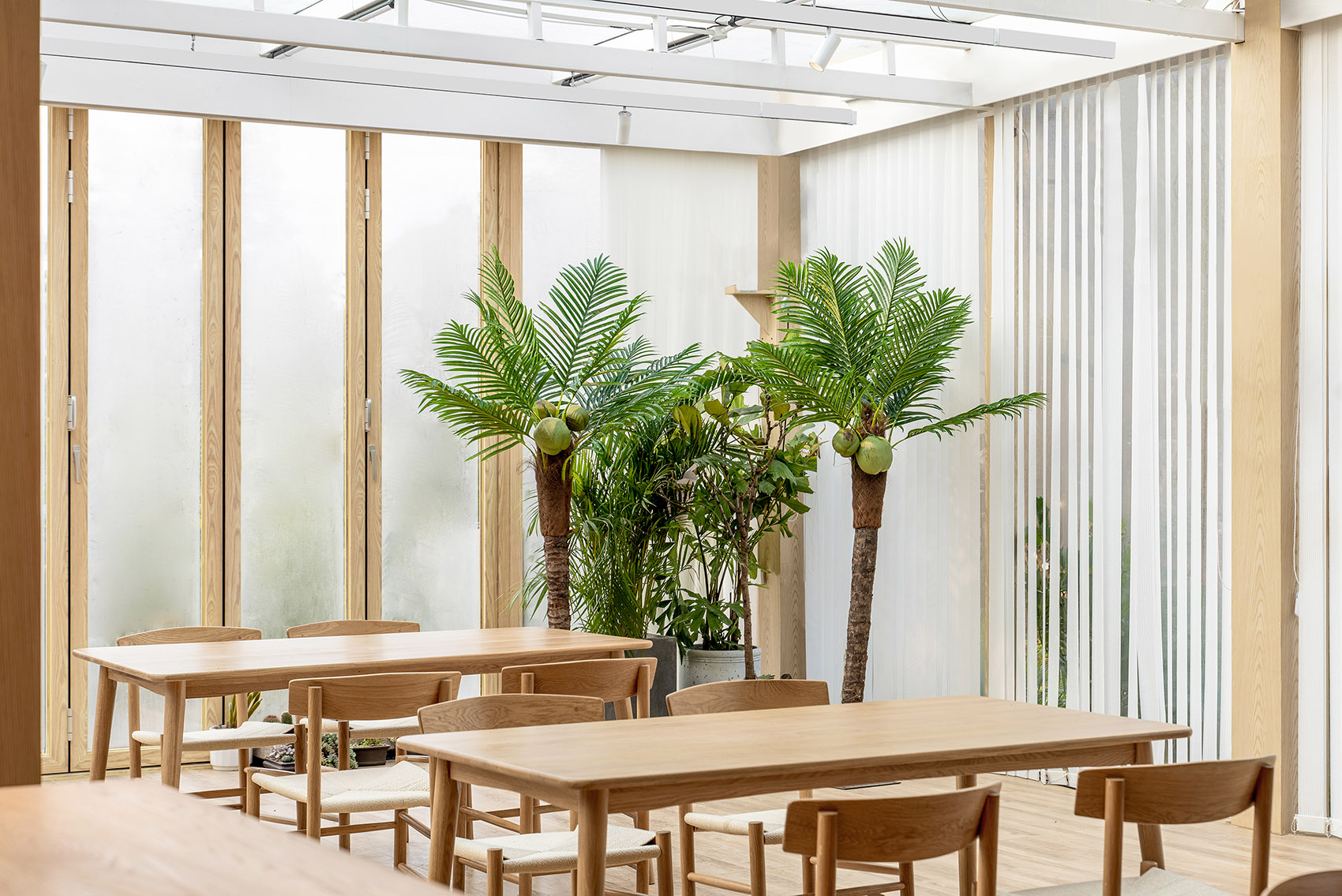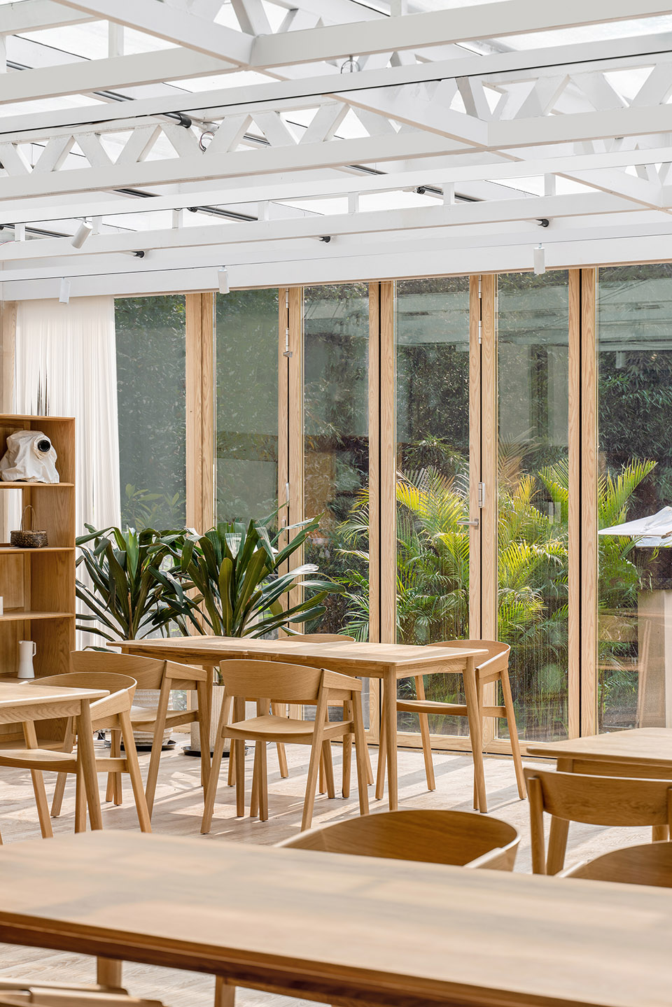 The design opens up the partition wall between the two original buildings, and the buildings are connected by glass corridors, adding glass sunroom and terrace steps to make the restaurant level a complete, permeable and open space. In order to enhance interior lighting, large areas of transparent glass curtain walls and glass folding doors are used.