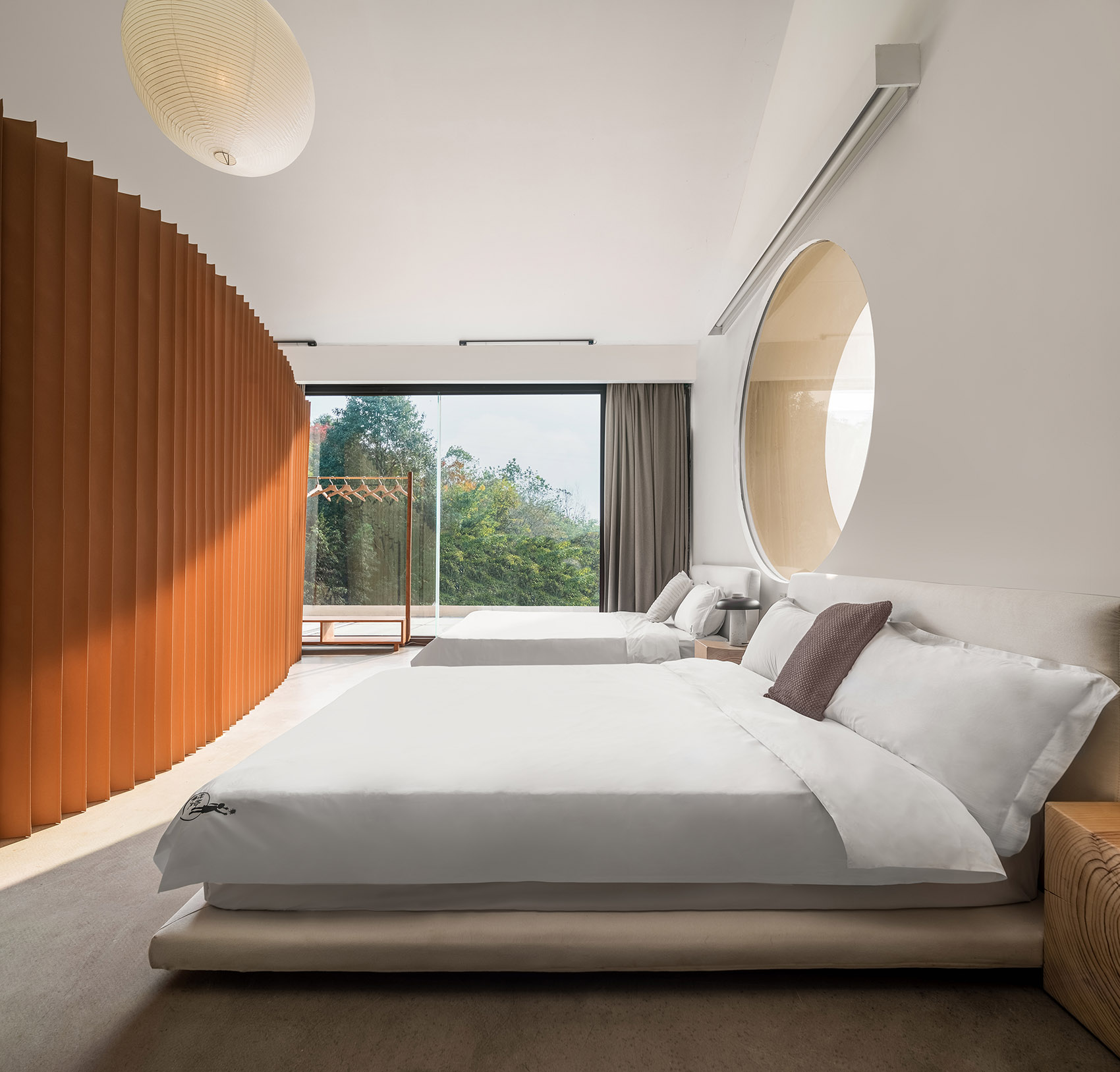 设计之初本想把落地窗改成门,这样当夜晚来临,嘉宾们可以站在玻璃房中看星星,但这个设想因为种种原因没有实现。外立面的圆窗在从室内向外看时起到了一定的框景作用,可以从二楼看到远处丛林的景色,整个空间温馨舒适。