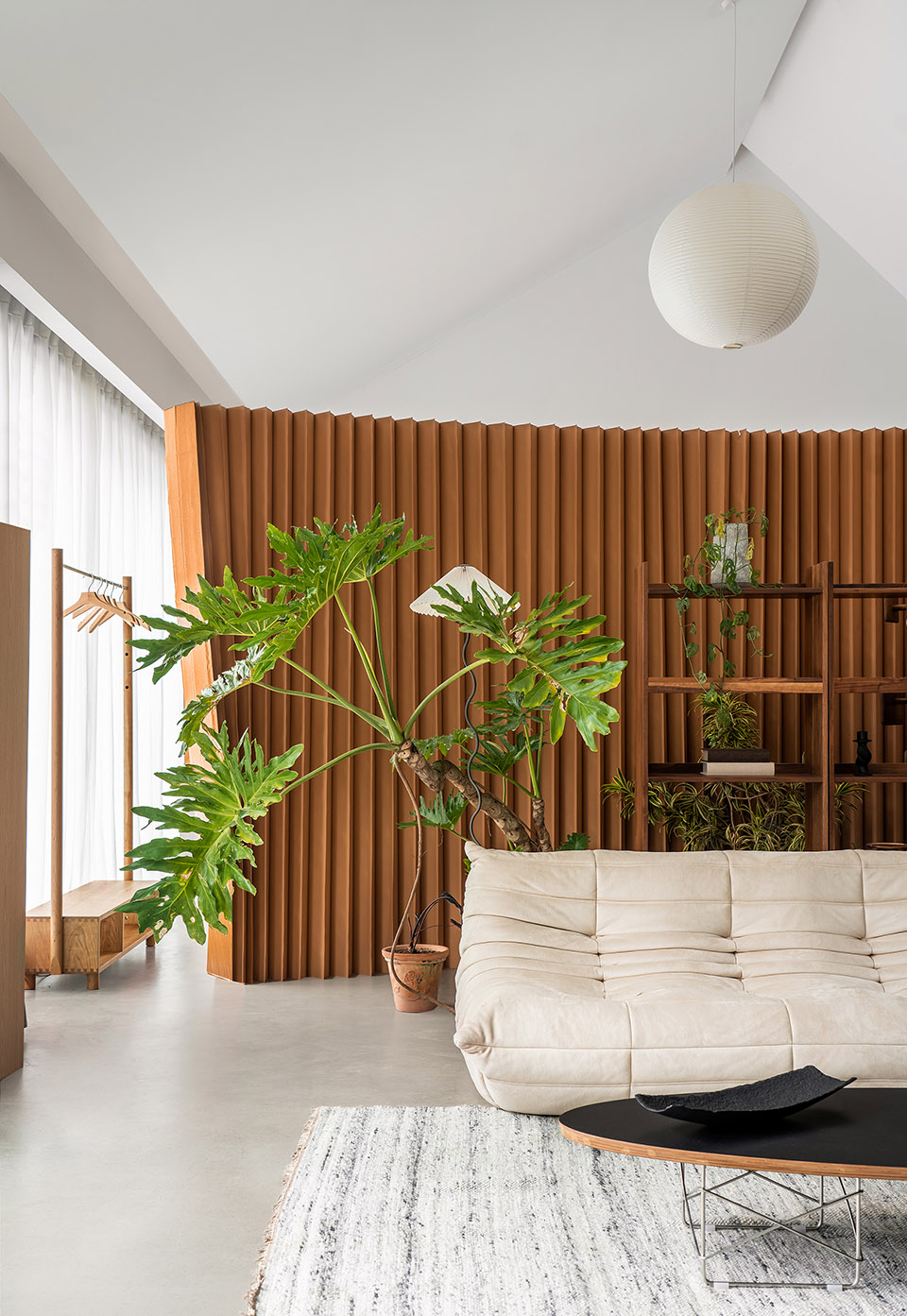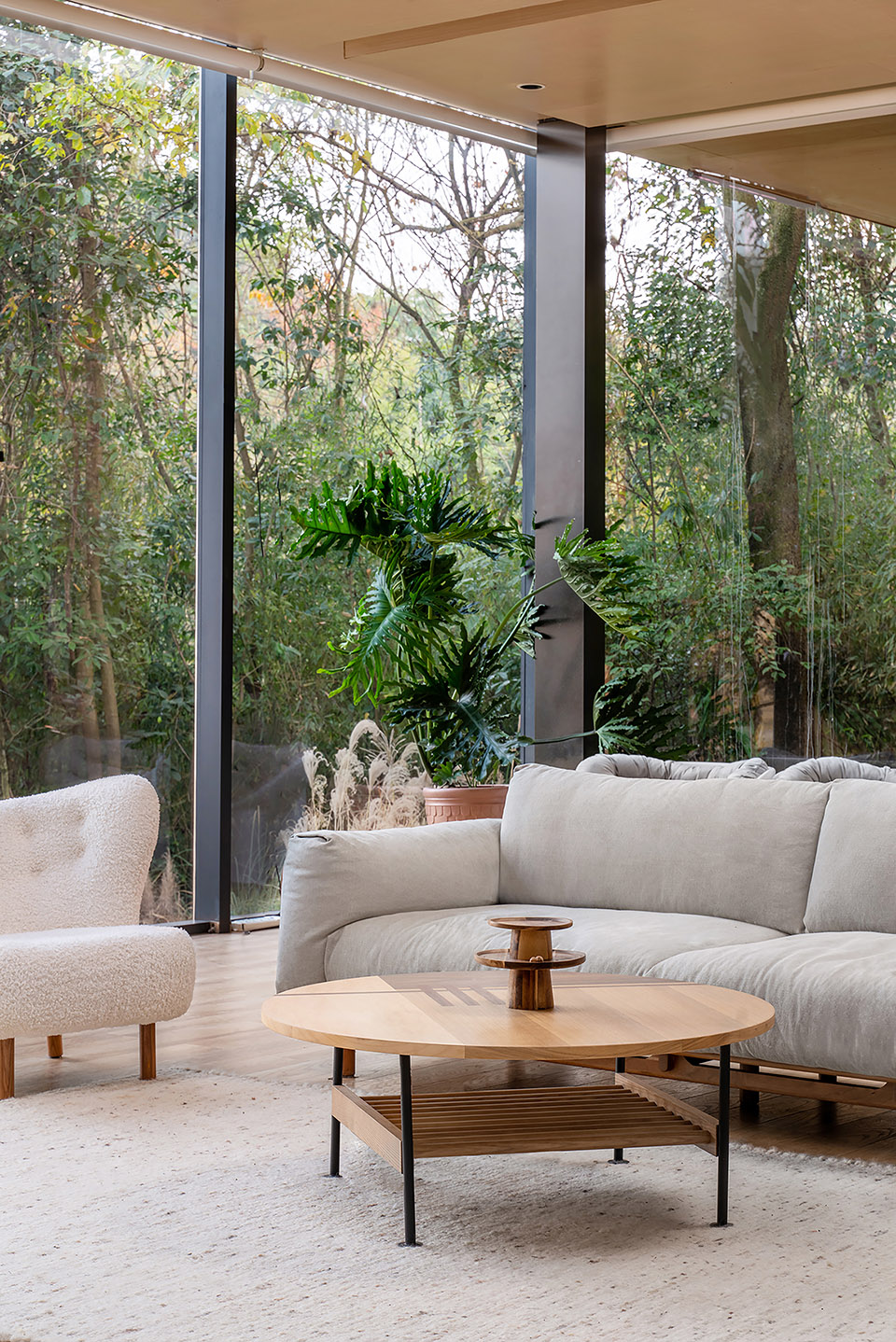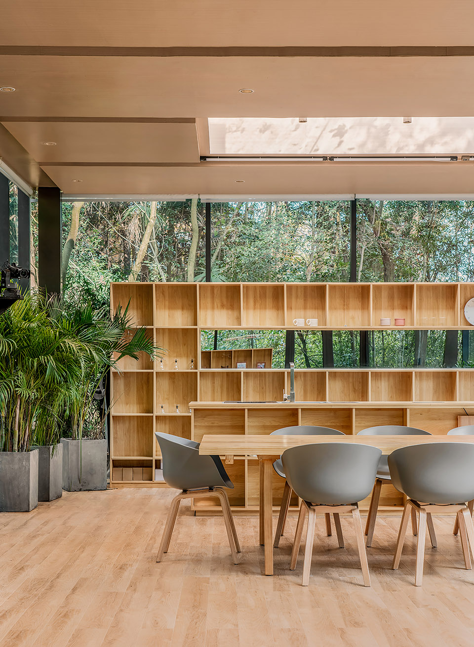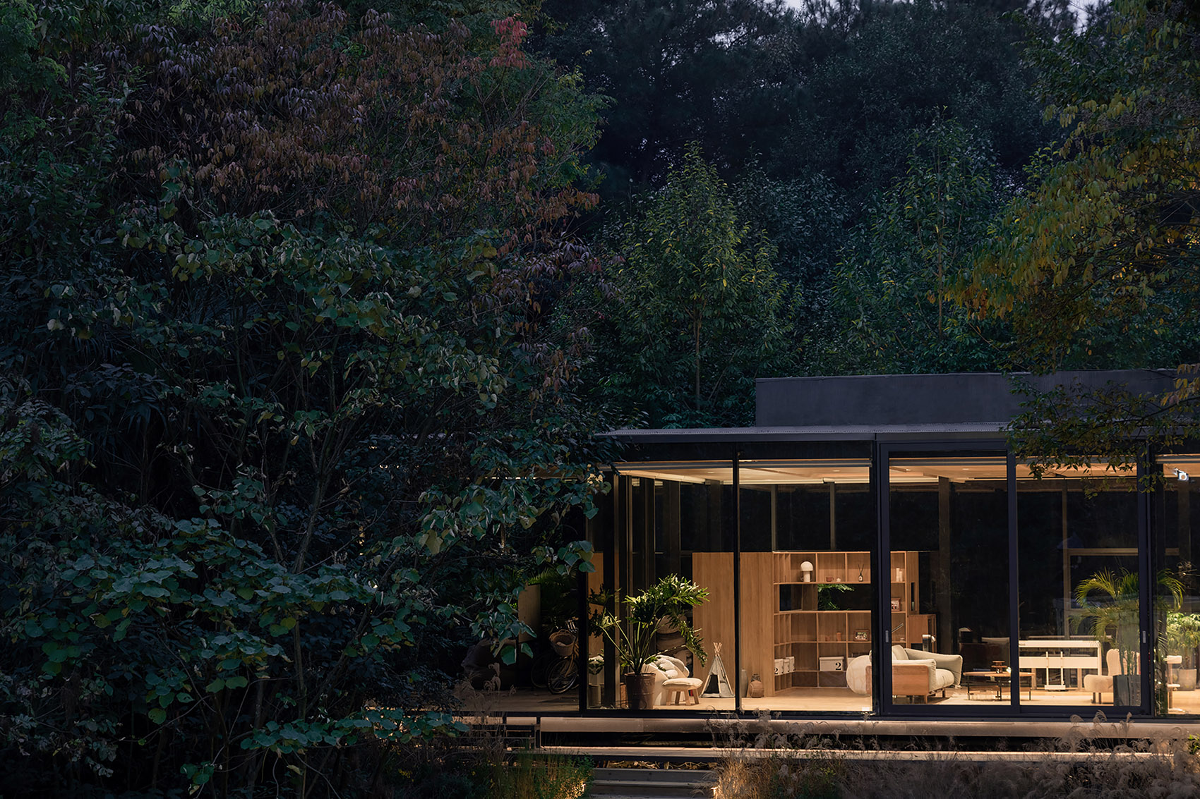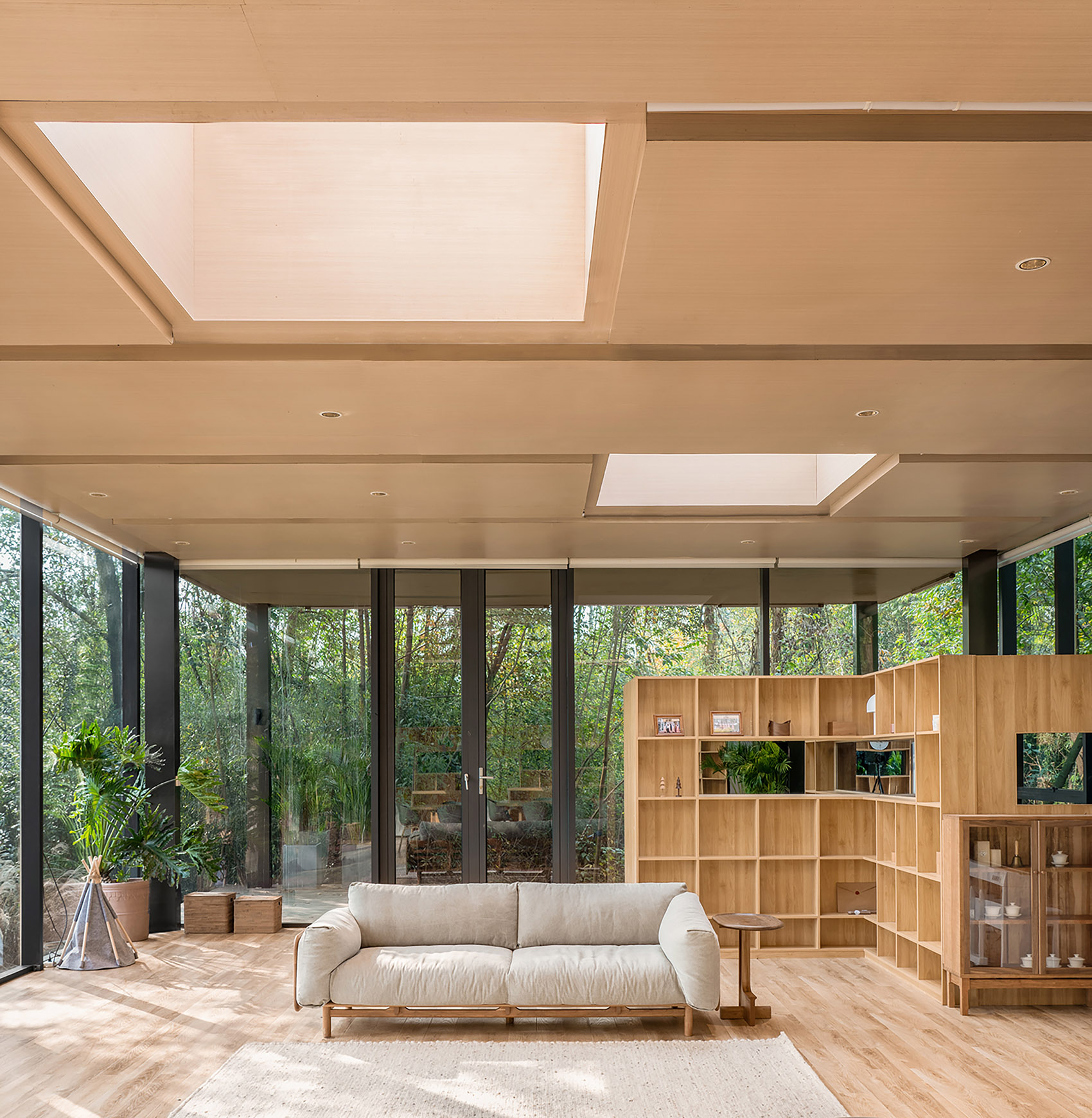 忘不了家族大客厅的设计灵感来源于“森林里的玻璃盒子”。我们希望人类在亲近自然的同时不破坏自然,它可以最大程度嵌入周围环境,但又不给周边环境带来负担。建筑屋顶设计了三个向上突出的天窗,不仅可以引自然光射入室内,增加室内的亮度,同时在突起的屋顶结构中暗藏空调设备,让室内顶部形成一个完整、干净的平面,使建筑更加简洁通透。