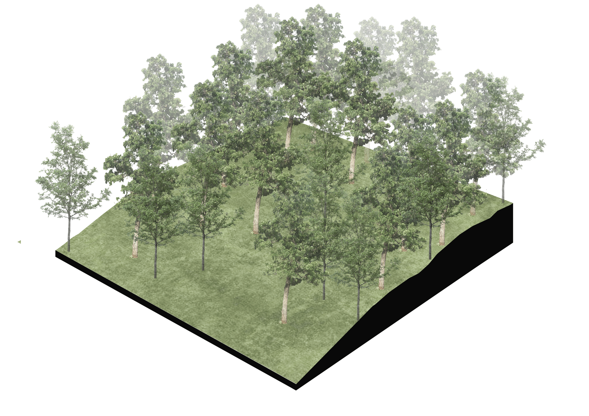 《忘不了农场》除对外营业的餐厅外还需新建一个供明星嘉宾、老人闲暇时间放松、休闲、活动的场所,一个融合多种活动可能性的空间——忘不了家族的大客厅。在项目初期,通过与节目制作方忘不了农场节目组对场地环境反复考察及沟通后,确定忘不了家族大客厅的选址,既要与餐厅具有某种联系,同时要兼顾场地环境不被破坏。因此餐厅正对面的树林成为首选,在空间上与餐厅遥相呼应,位于树林之中,通透隐藏于自然。