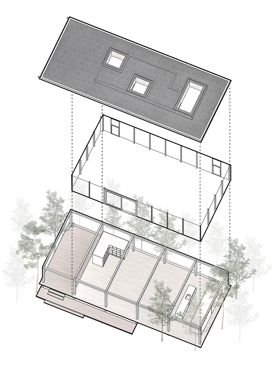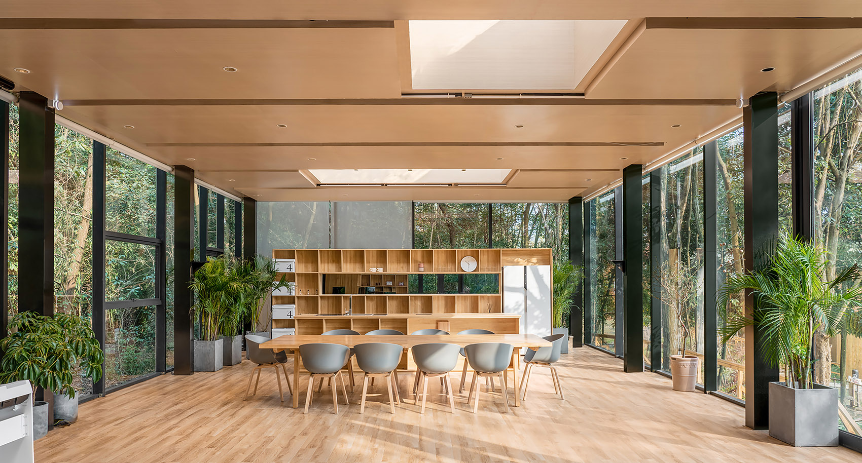 The design of the Forget me, not farm drawing-room is inspired by “a glass box in the forest”. We want human beings get close to nature without destroying it, it can be embedded in the surrounding environment to the maximum extent, but without burdening the surrounding environment. Three skylights protruding upward from the roof of the building are designed not only to draw natural light into the interior and increase the brightness of the building, but also to conceal air conditioning equipment in the protruding roof structure, so that the top of the interior forms a complete and clean plane, making the building more simple and permeable.