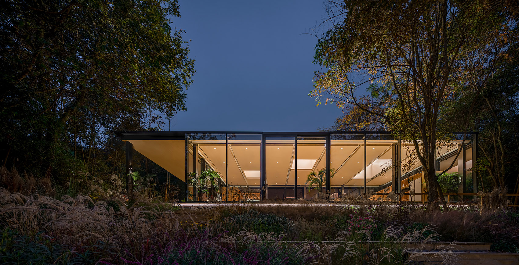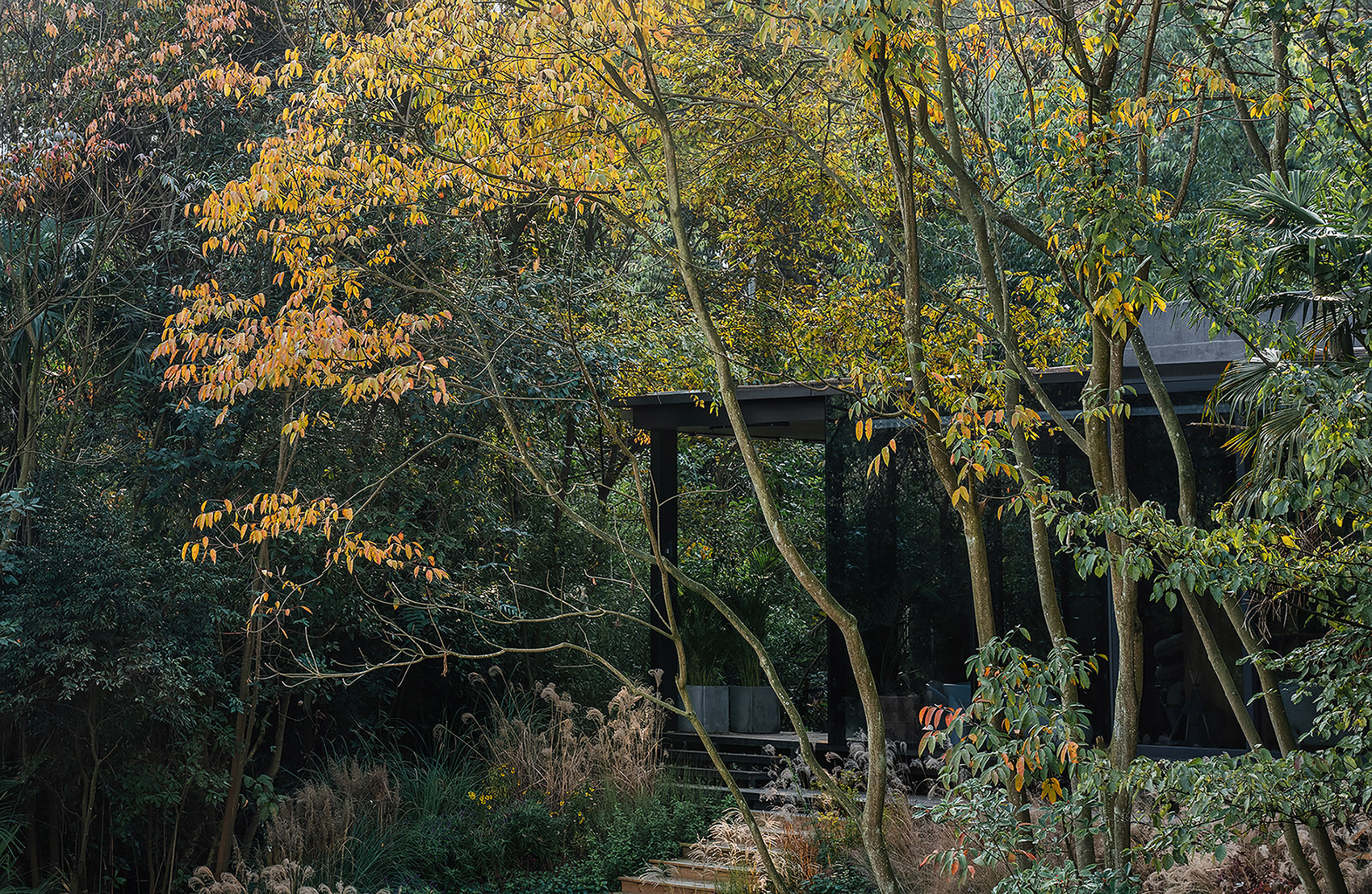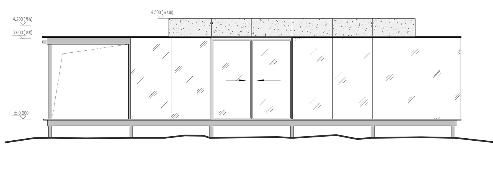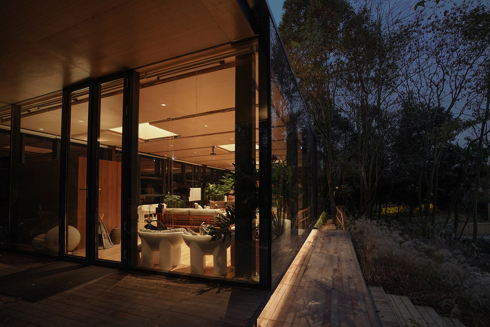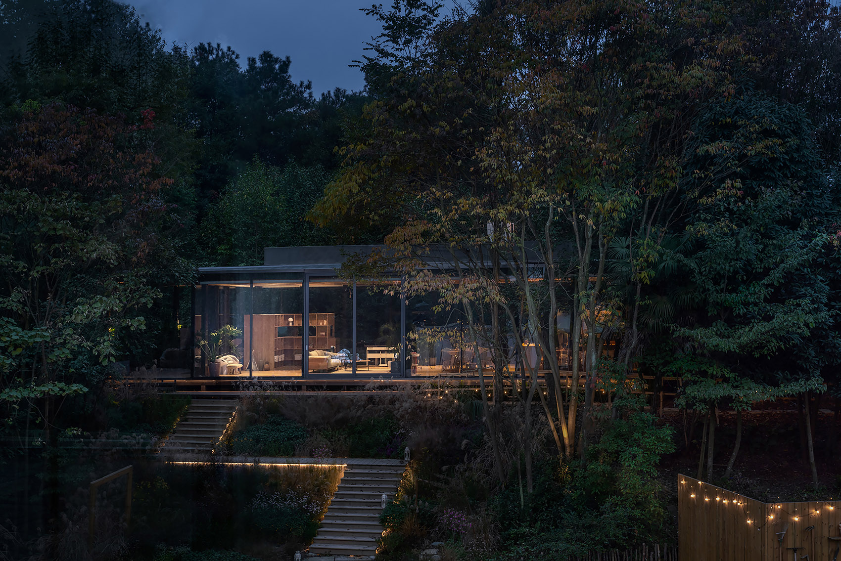 In order to minimize the damage to the terrain and to better hide from the surrounding environment, the building adopts the form of steel structure overhead, surrounded by a transparent hidden frame glass curtain wall on the outermost side of the steel frame, while wrapping a part of the top structure, so as to maximize the invisibility of the building steel frame structure, making the building lighter and more permeable. The view from the restaurant is as if the drawing-room is integrated with the woods, disappearing into the forest.