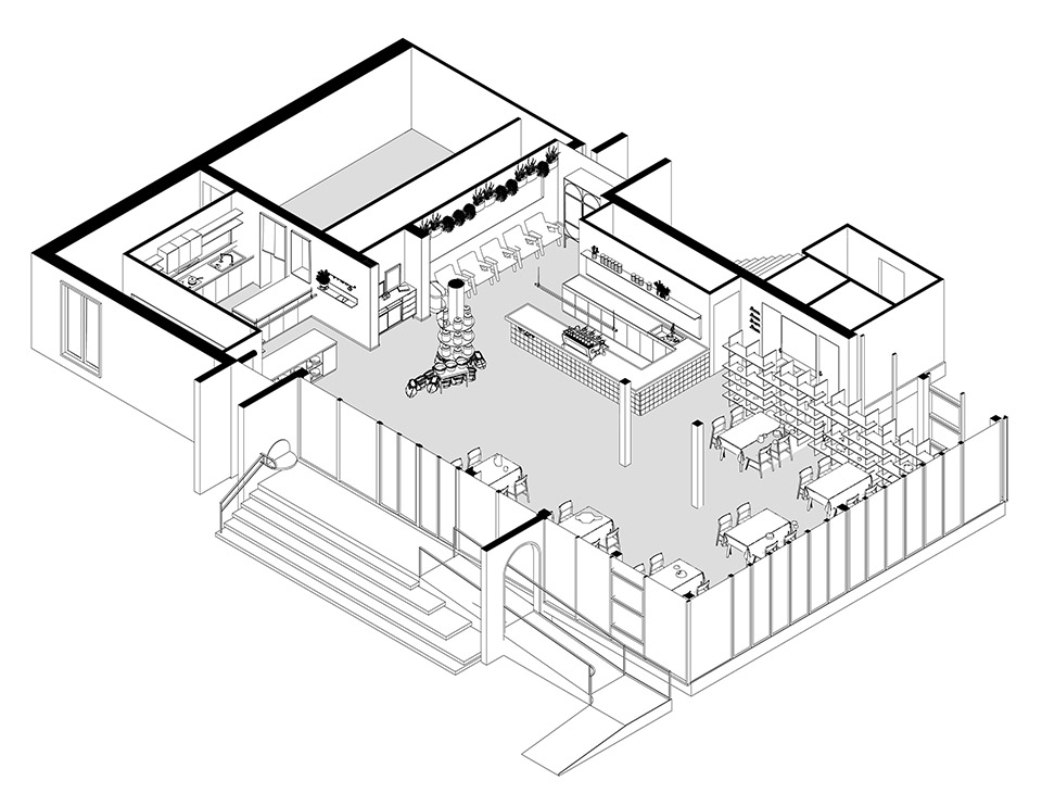 The original building of the restaurant is two separate entities with inconsistent design style and hidden entrance. Facing the current situation that most of the patients suffering from cognitive impairment are detached from the society and closed themselves. We hope to break the closed feeling of the original building and create an open, bright, warm and age-friendly space.