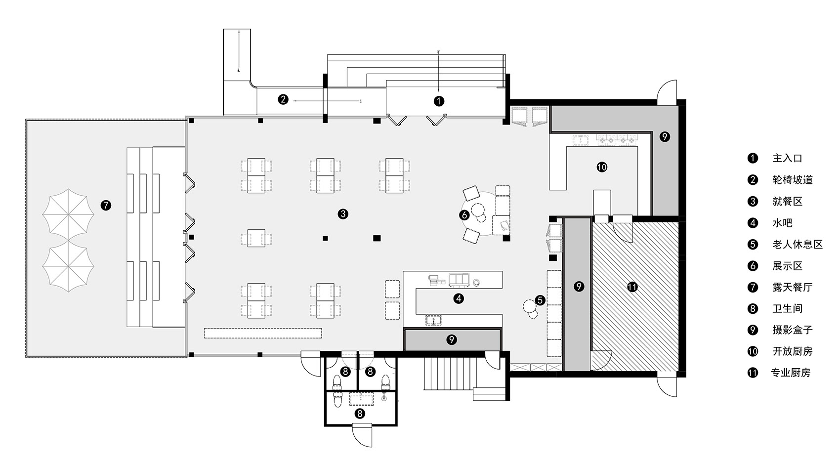 In order to minimize damage to the natural environment, the design team only transplanted the trees and flowers around the site that blocked access to the main entrance to the side, while other plants were not affected by the building renovation. The restaurant level is public area, in which the dining area contains three parts: indoor dining area, sunroom dining area and terrace dining area. Different areas bring different dining experience with the change of natural lighting and seasonal scenery. The design team hopes that the elderly with cognitive impairment can enter the society and live an optimistic and cheerful life. Therefore, more aging-friendly designs were added to the design, such as handrails on the ramp of steps, the choice of non-slip materials, sockets at the appropriate height to avoid the elderly from bending and squatting excessively, as well as the setting of resting areas for the elderly.