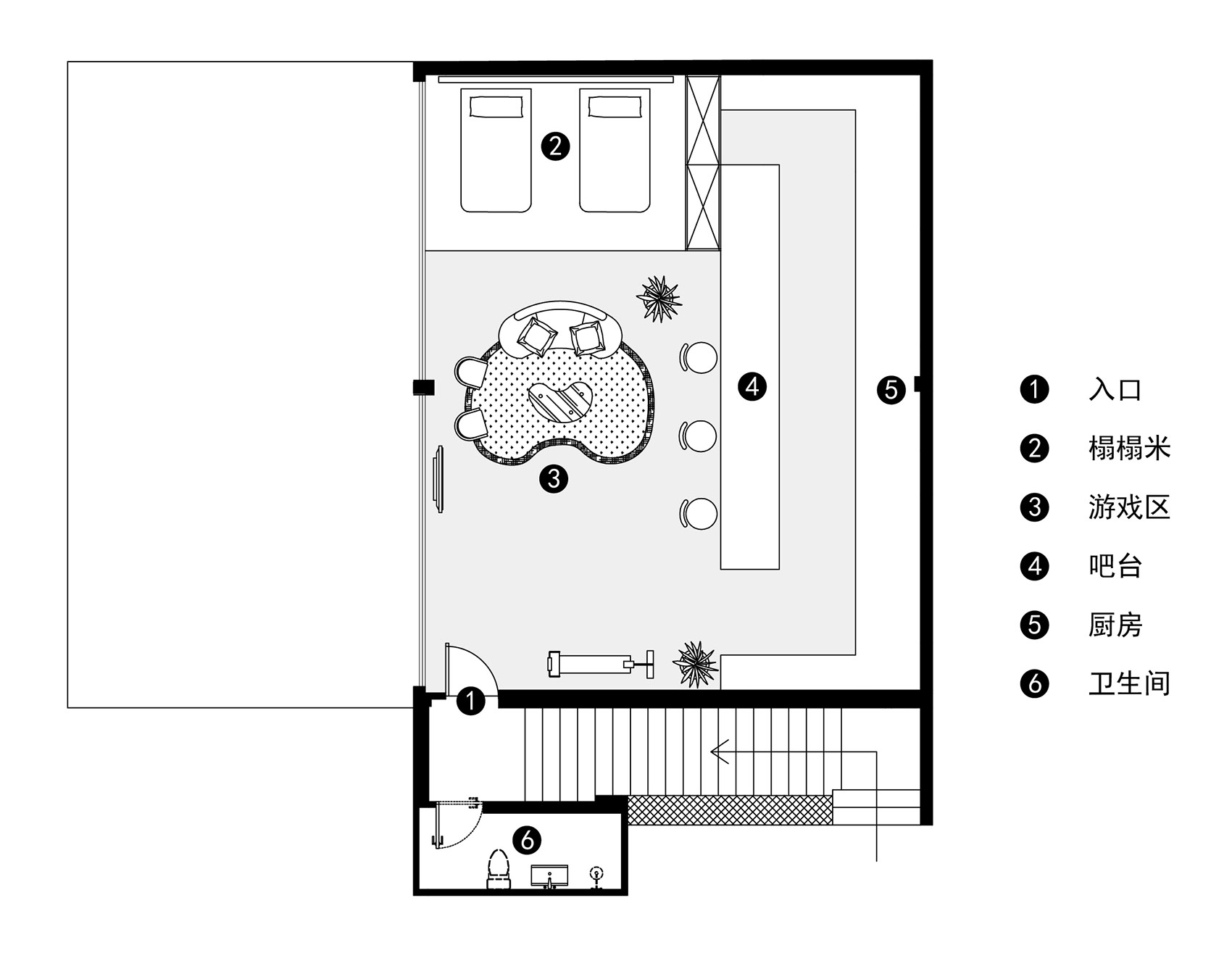 二楼为嘉宾居住的房间,原有的开放式厨房和水吧台被保留了下来,活动衣柜与屏风用来分割空间,增加空间的私密性。