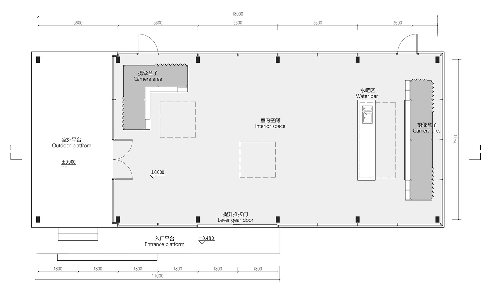 节目组提出室内需要一个开放的水吧区域,以便老人和明星嘉宾在家族活动时使用。室内的水吧区域在天窗的正下方,阳光沿窗洞洒下,树影随着时间的推移散落在水吧台的各个角落。同时,室内设备均隐藏在水吧台下,并使用智能无线开关,解决了在开敞无墙的空间无法穿线的问题,室内空间更加整洁开阔。