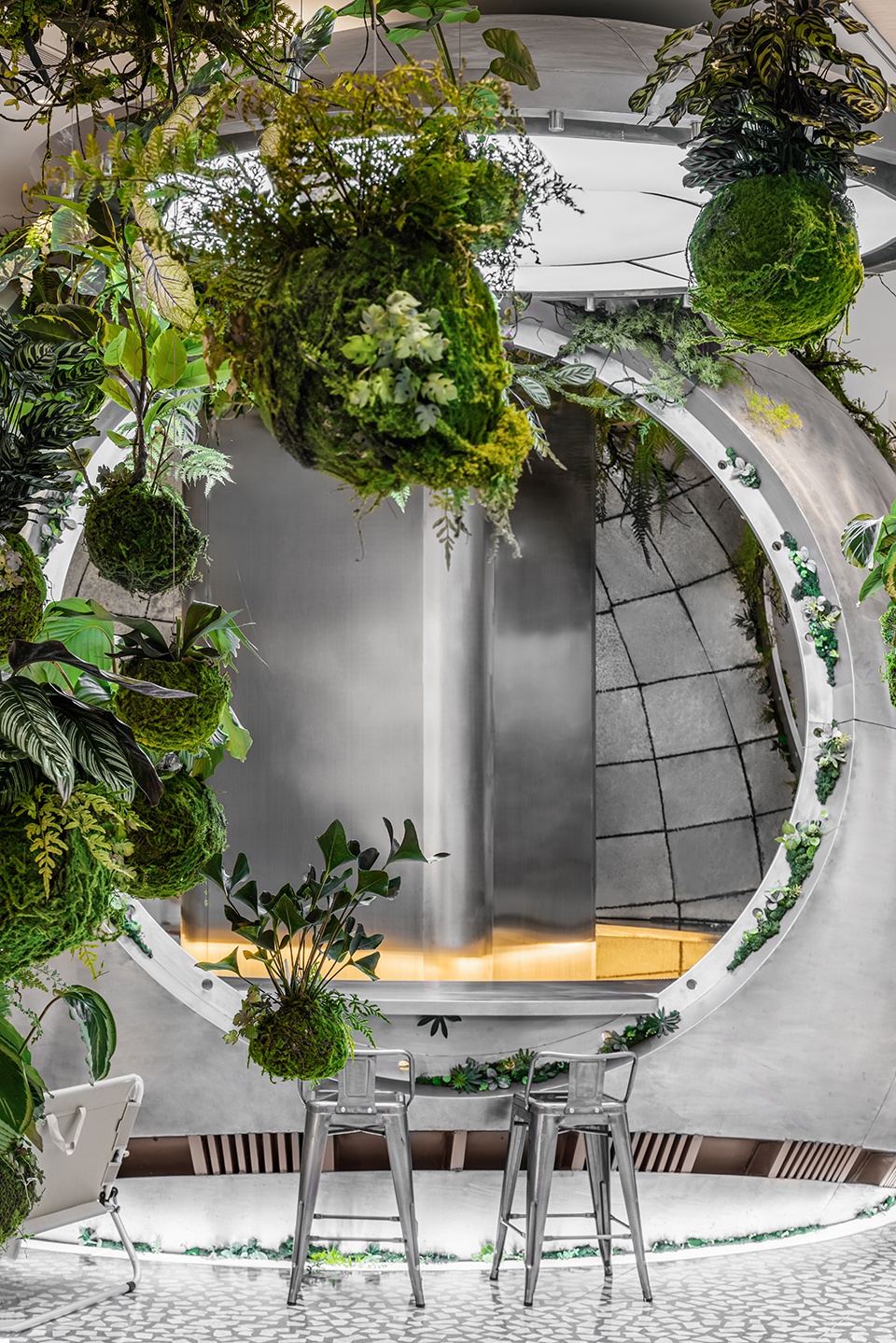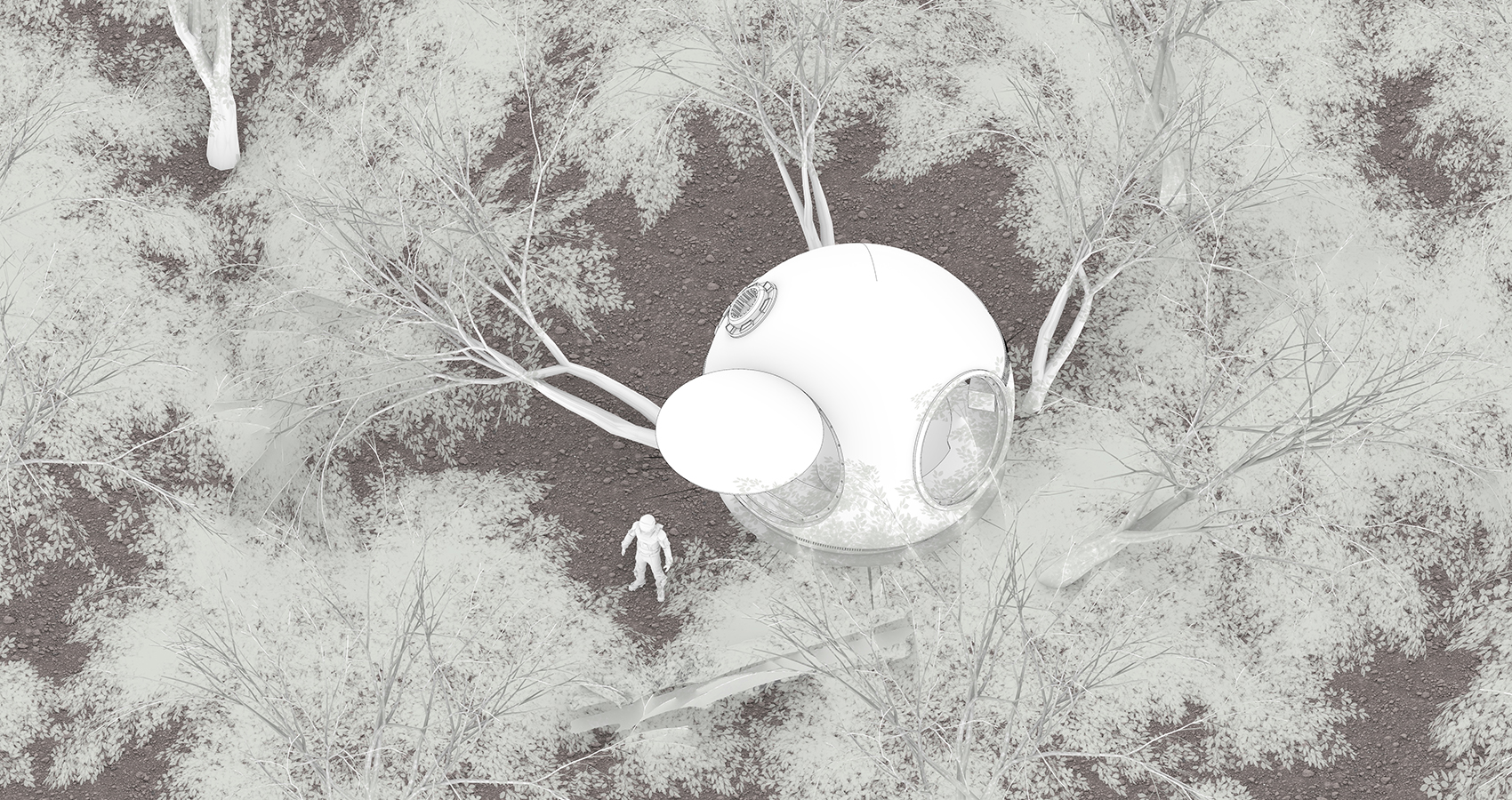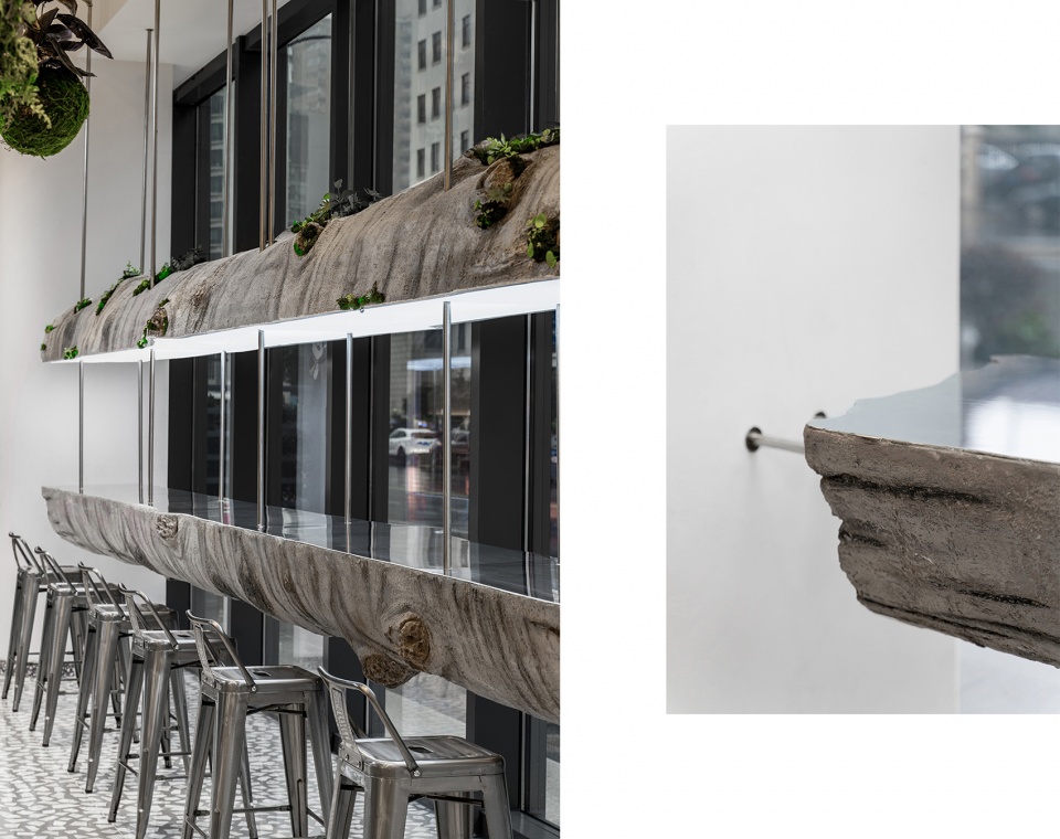 Cutting through the trees, instead of the familiar wood fibres, is a smooth, mirror-like metallic substance. The trees float in the air, eerie cross-sections reflecting this wonderful but strange world. Eventually, the frustrating reality is discovered: there are no humans here, and no nature either, this is not a real world, everything is unreal. The long table “suspended” in mid-air is derived from a cut tree trunk, and its mirrored cross-section perfectly reflects the world of tall buildings outside the window. Raising the coffee cup, the reflection of the world outside can be seen from the table top, as if it were a million years away.