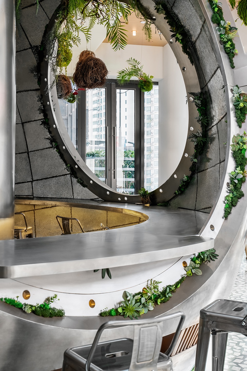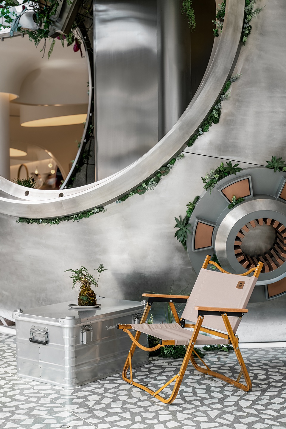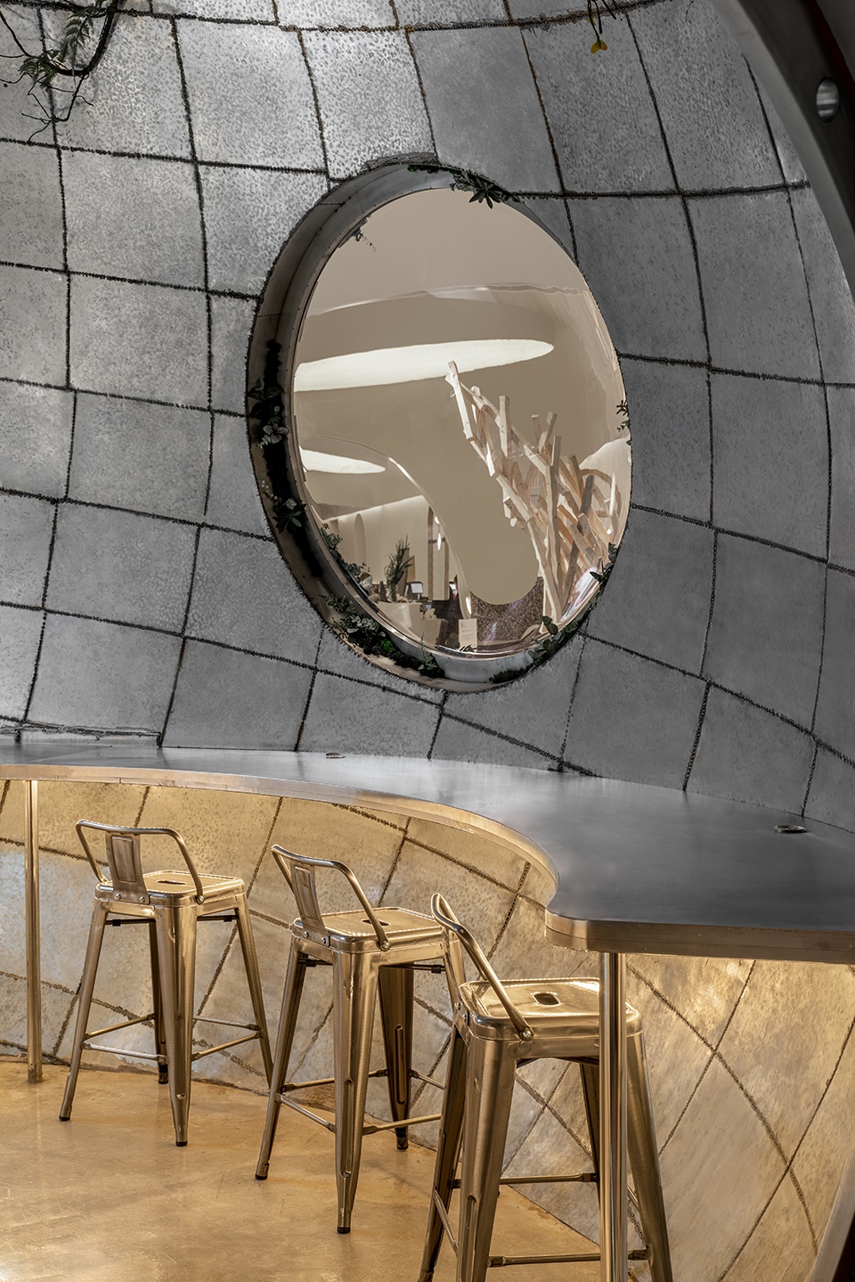 The coffee worktop is an evolution of a scrap capsule. After being polished, it seems to have been made new again. The lights from the hatch cover brighten up the entire coffee-making area and add a touch of mystery. Surrounding is the vegetation that grows naturally on the ruins. A beam in the middle of the capsule acts as a support for the entire structure and light pours in through two windows. Visitors can sit inside and outside the capsule and look out at the view, as if they were flying a spaceship through space. The immersive space café journey enhances the ambience to the max. The camping element also enhances the immersive dining experience. The metallic wooden boxes and low seating bring the user one step closer to the surface, as if sitting on the surface of Mars with a glittering galaxy in full view.