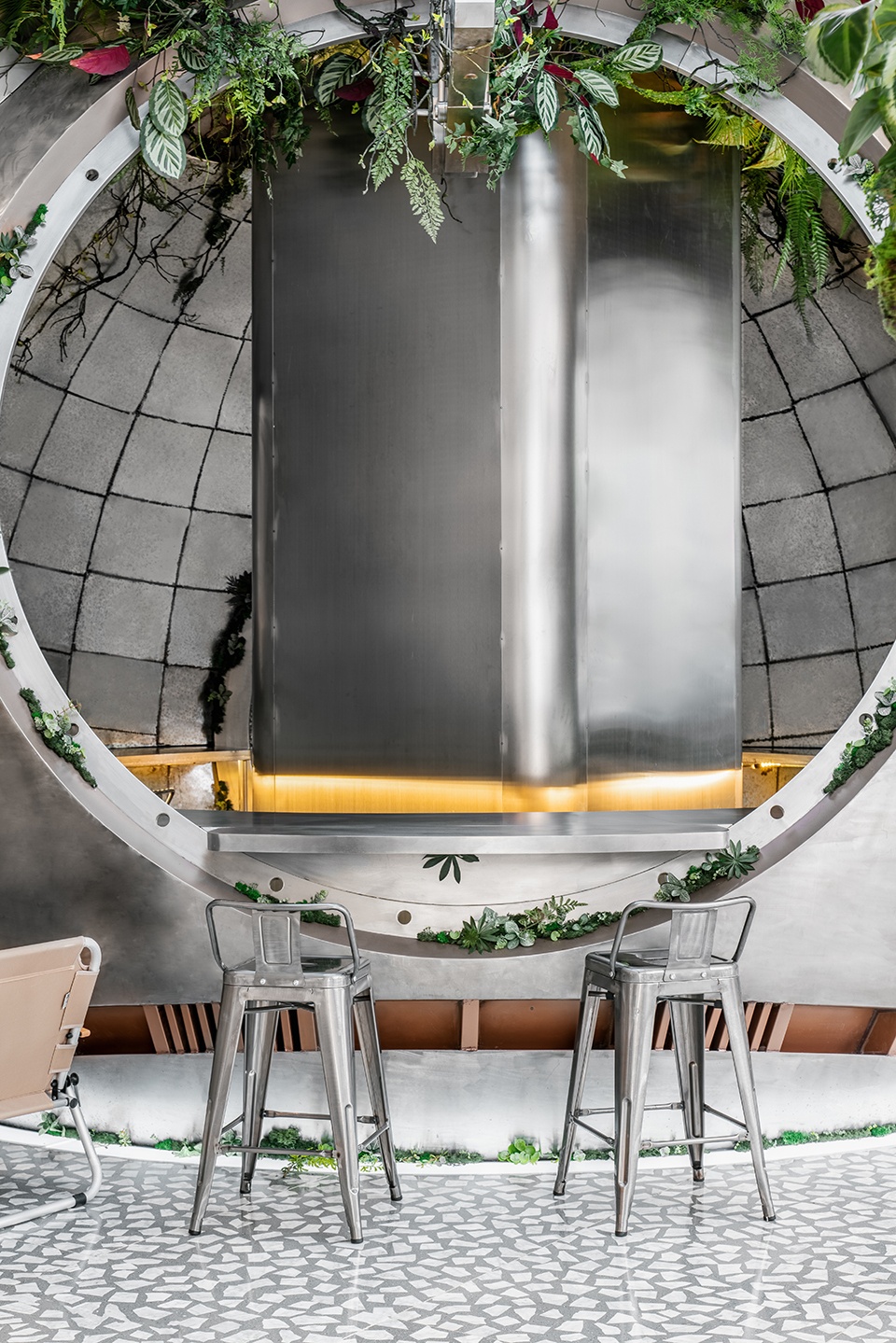 咖啡操作台是由废旧的舱体演变而来,在经过打磨后,它似乎又焕然一新了。机舱盖的灯光使整个咖啡操作区域变得明亮,也增添了一丝神秘的色彩。周边是在废墟上自然生长的植被。舱体中间的梁柱作为支撑整个结构,光线通过两个窗口洒进来。到访的顾客可以坐在舱体内部和外部就坐,看着外面的景色,仿佛驾驶着宇宙飞船在太空中遨游。沉浸式的太空咖啡之旅,将氛围感提升到极致。露营元素提升了沉浸式用餐的体验感。金属材质的木箱和低矮的座椅,让使用者离地表更近了一步,仿佛坐在火星的表面,闪烁的银河系一览无余。