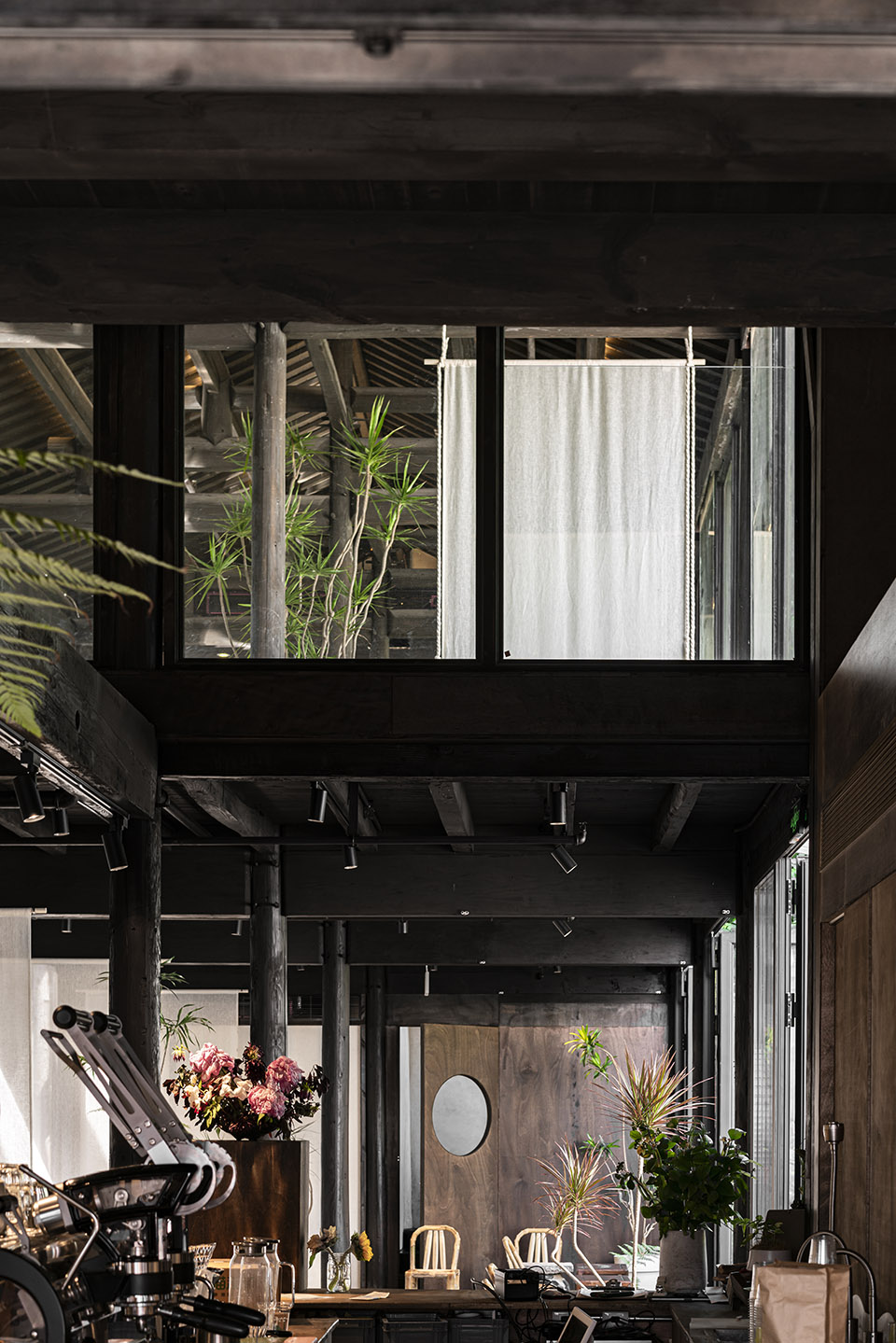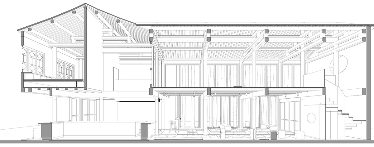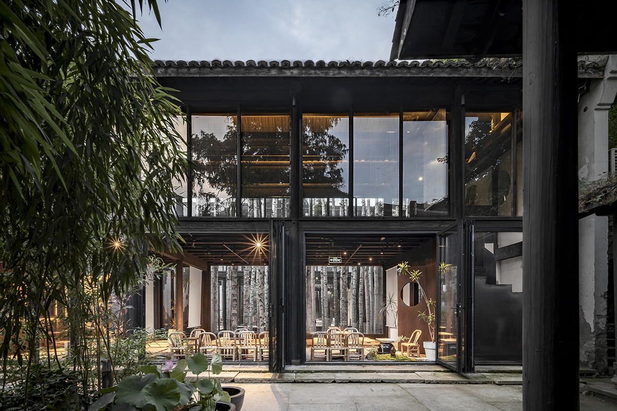 首层西侧三跨立面改为折叠门,成为店铺的主要入口。西侧折叠门可全部向小院打开,最南侧则改为落地玻璃。二层开放空间的实体墙面与老窗户全部改为落地窗,未来二层举办活动时会更加明亮开放。