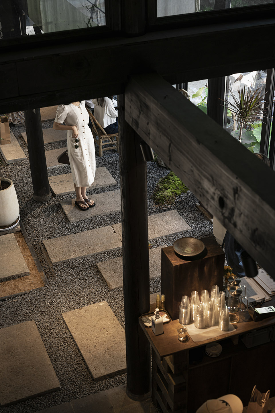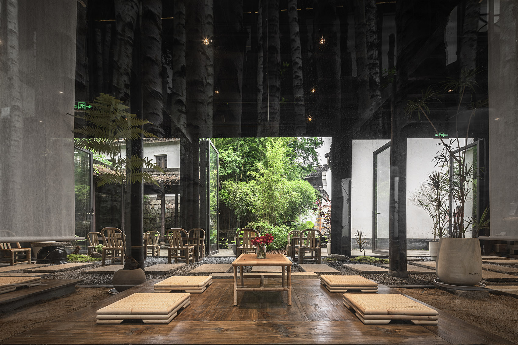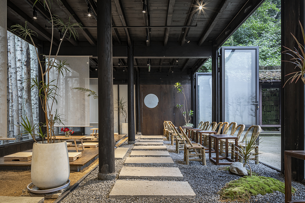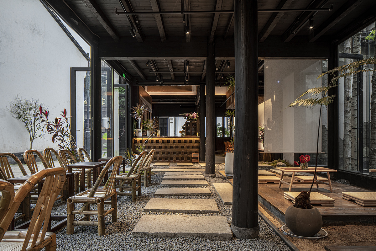 从一层空间南侧的回型台阶上到二楼空间,是完全开放的禅室冥想空间,兼具休息与活动功能。地面采用黑色不锈钢材质,将一侧大井巷古色古香的街道场景与另一侧中庭中沉静肃穆的景观装置,同时反射进二层空间,使得禅室与周围的自然环境融为一体。时移世异,古人对于饮食生活的精致态度与文化精神,在铁手咖啡制造局的饮食空间内得以传承延续。