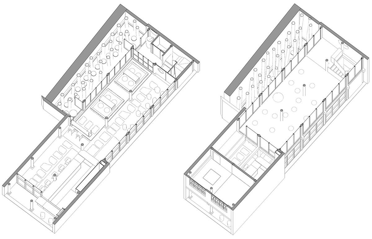 The original façade is set back by 1.2m for display purpose. The north façade of first floor is replaced and glazed with openable glass doors and windows. The bar counter extends to the streets, creating an potential interaction between internal and external.