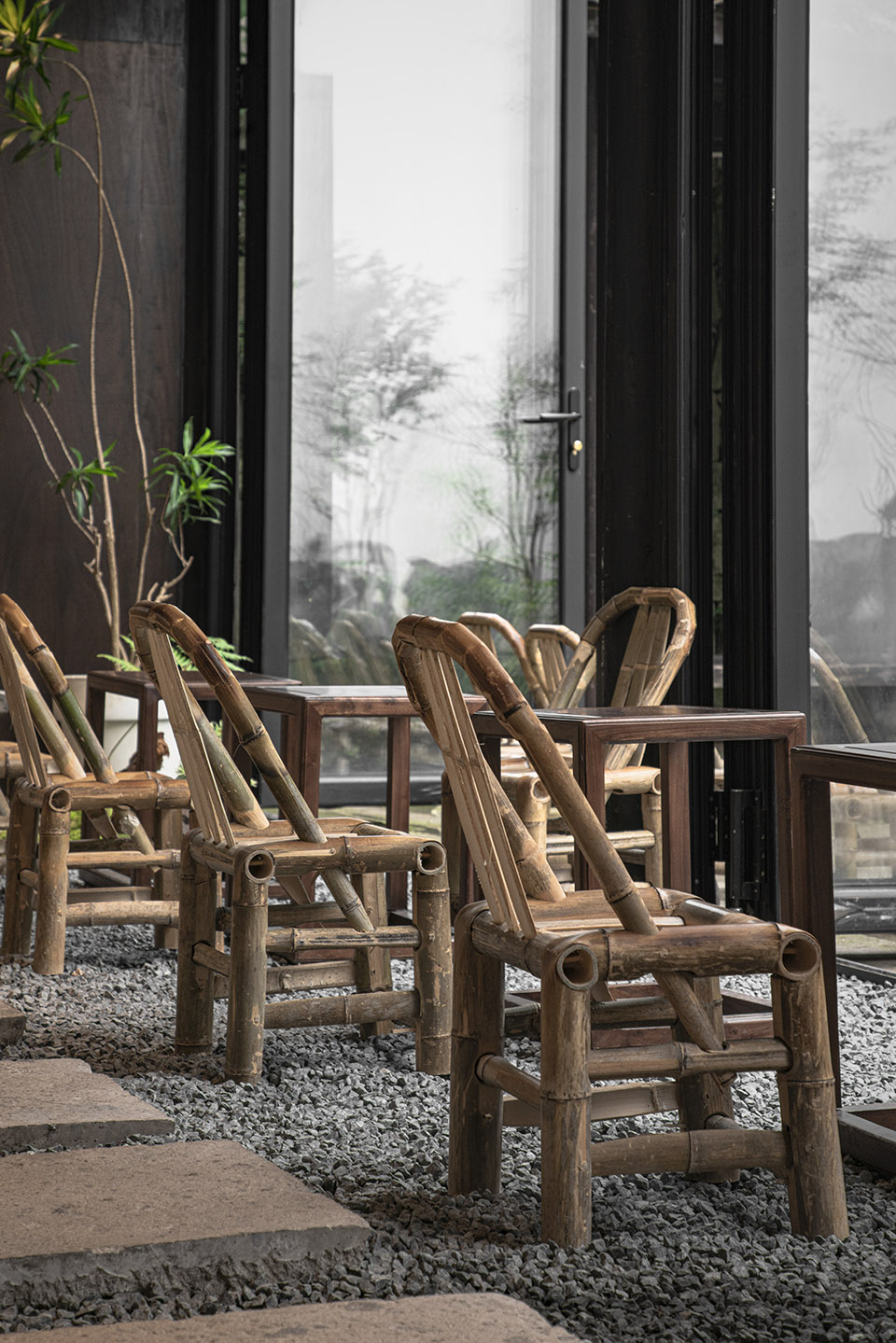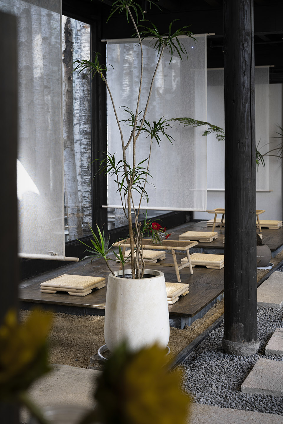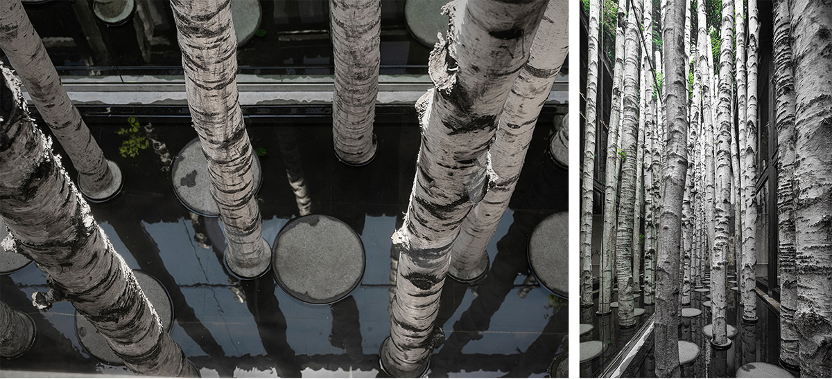 At the vacant patio on the east side of the building, we array the trees as landscape installations to create a mysterious and poetic spatial experience. The coffee shop seems to be surrounded by a forest from the street side.