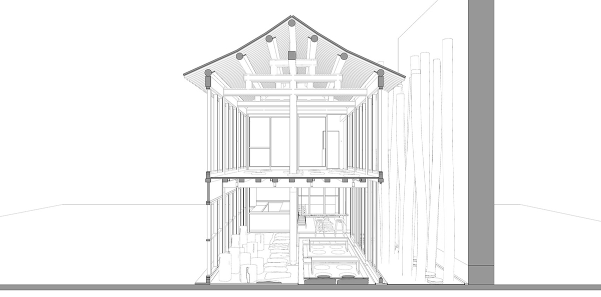 The three-span facade on the west side becomes the main entrance of the store, it were replaced with the folding door. The folding doors are able to open up to the small courtyard. The solid walls and windows ofsecond floor were also replaced with floor-to-ceiling windows. In Which, it will bring more lights when events are held on in the future.