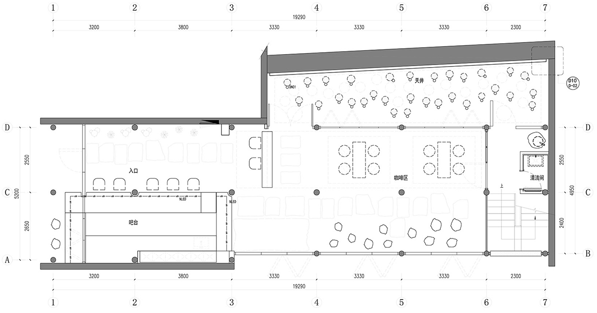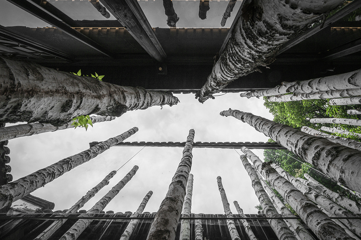 建筑东侧空置的天井处,我们使用阵列形式的树木作为景观装置,制造出一种神秘诗意的空间体验。从入口的小院处观察,咖啡店铺仿佛包围在自然环境之中。