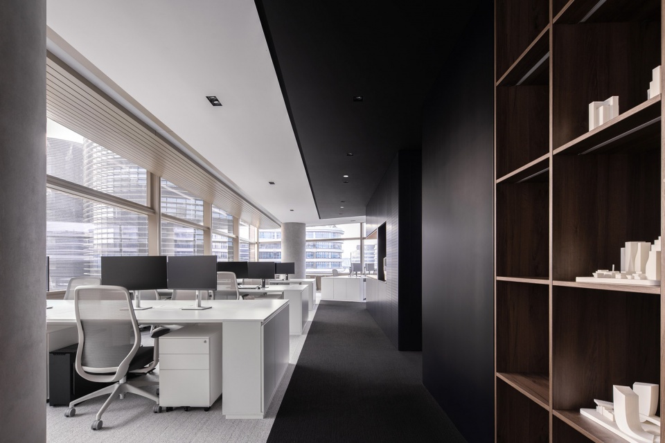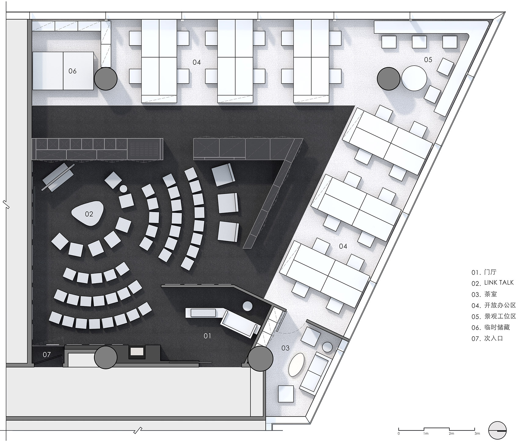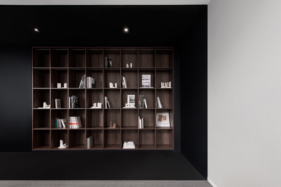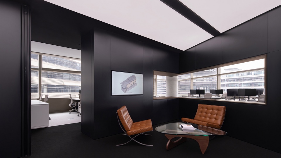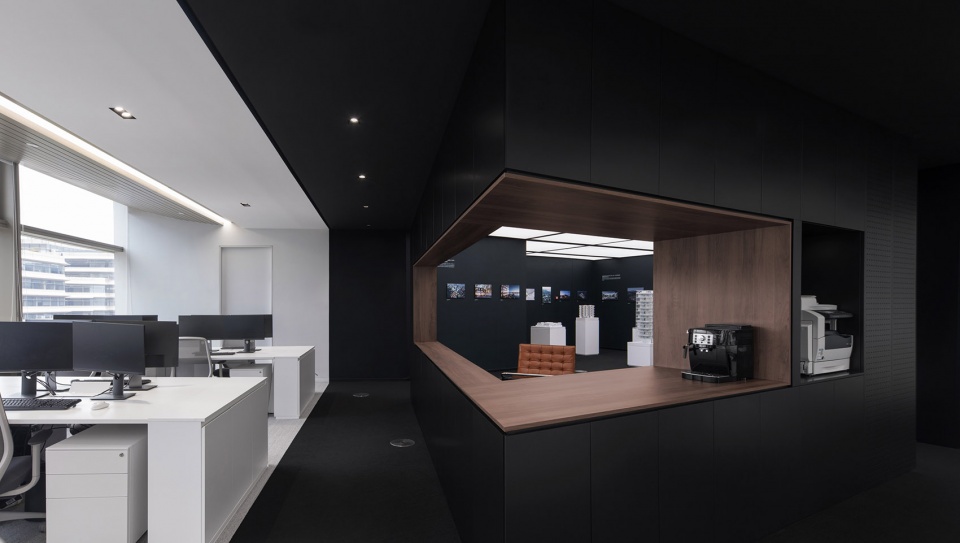 为了让功能区域最大化,我们将所有辅助功能集中在用以做空间分隔的中部墙体。水吧台、打印机、服务器机柜、书籍模型展柜以及储藏等功能对应地向两侧提供服务。墙体保证了两个区域一定的独立性并丰富了空间层次。在锐角侧打开的取景框对应建筑形体,不仅让接待区的使用者享受城市景观,更是对不同区域间互动沟通的促进。