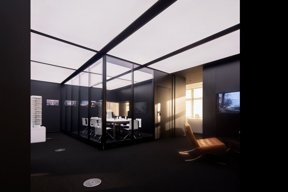 Employees conducting meetings and conversations, as well as clients visiting, will all pass between the two spaces on a regular basis. Even if the room is only 300 square meters, the movement of space and colours may provide a rich experience.