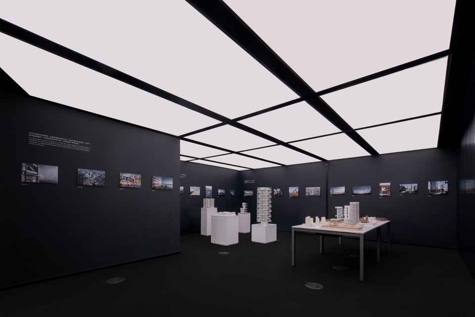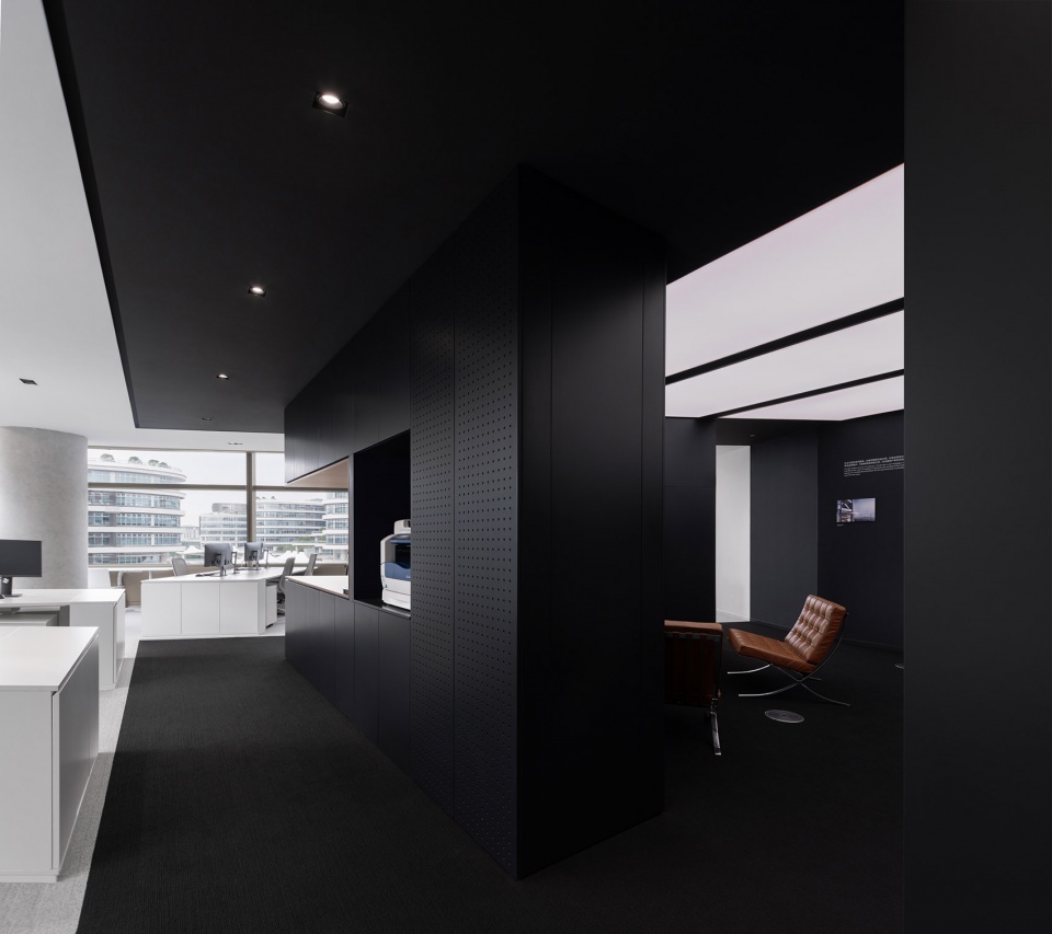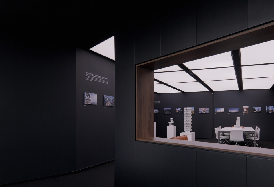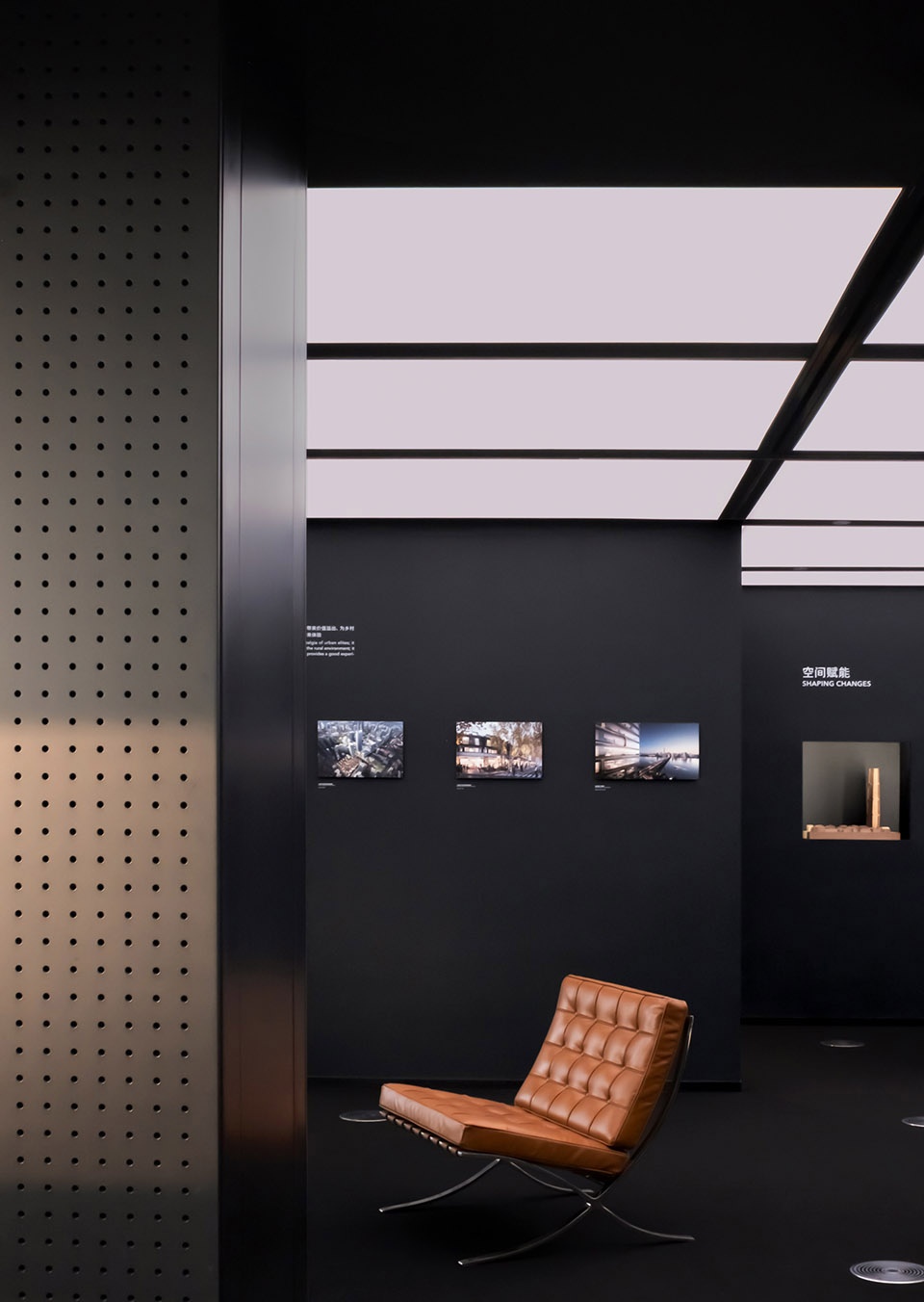 The black wall and floor, along with the bright film system on the ceiling, provide a pristine atmosphere in the public space while also highlighting the exhibition spaces. The latex paint on the wall, the lacquer surface, and the carpet on the ground were particularly selected to achieve the consistency of the presenting effect, taking into account the various lighting circumstances and the differences in the materials.