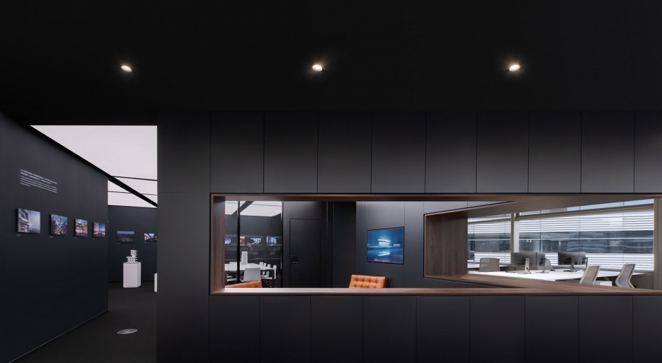 深色的墙面地面配合顶部的发光膜系统塑造了公共区域的纯粹气质,也更能凸显展品本身。考虑到所受光照条件的不同和材质本身的差异,墙面的乳胶漆、烤漆面以及地面的地毯都做了专门的颜色挑选,以确保呈现效果的统一。
