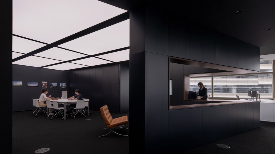 The office area, consisting of white office furniture and white carpet, contrasts with the dark color of the public area, maximizing the bright atmosphere created by natural light. The original golden aluminum plate on the top is naturally integrated therefore, and the impact on the interior space is minimized. When employees have landscape workstations on the side of the end windows, they will have a better lunch mood.