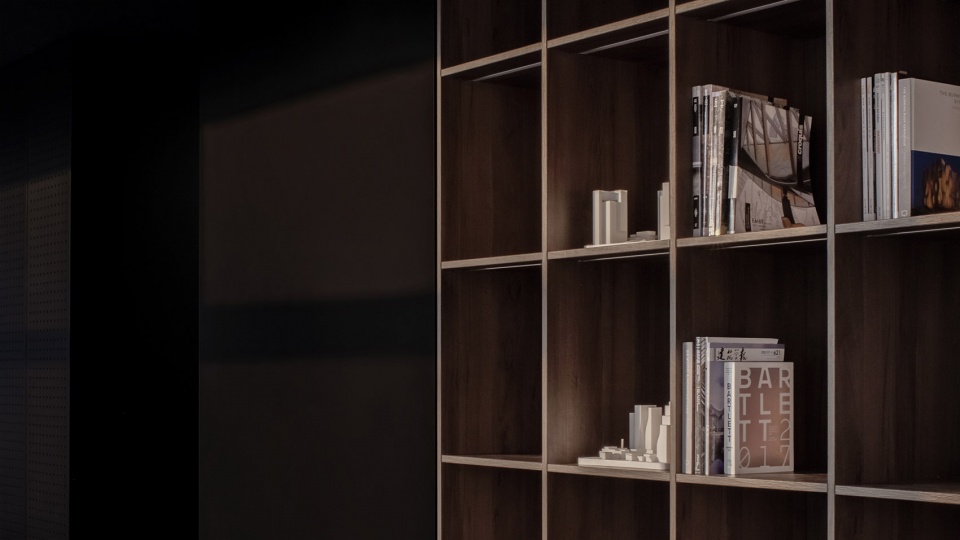 All auxiliary functions are concentrated on the center wall for space separation in order to optimize the functional area. The water bar, printer, server cabinet, book model display cabinet, and storage functions are all supplied on both sides. The wall provides a degree of separation between the two sections while also enriching the spatial levels. The viewfinder frame opened on the acute angle side corresponds to the building shape, which not only allows the users in the reception area to enjoy the urban landscape, but also encourages engagement and dialogue across different locations.