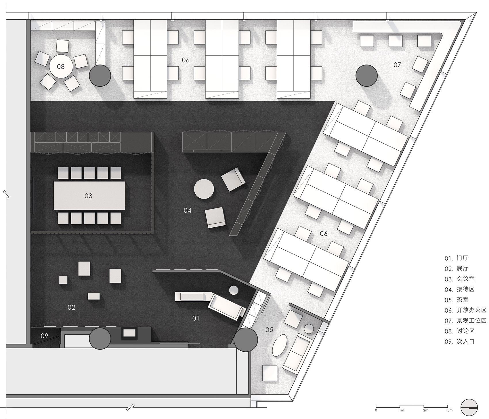 设计遵循原有的场地平面逻辑,将空间分为办公和公共两个区域。办公区域自然沿幕墙侧展开,同时拥有敞亮的办公氛围和一定的私密性。公共区域则包含了前台、展厅、会议、接待等功能。