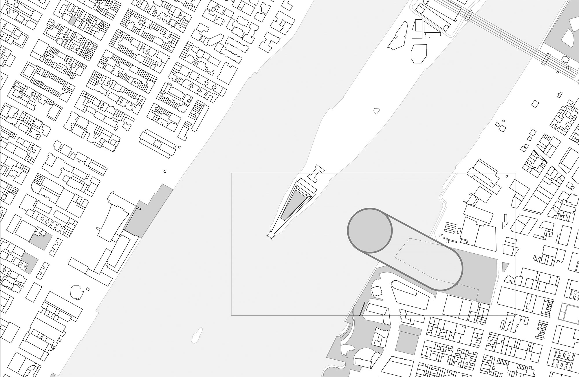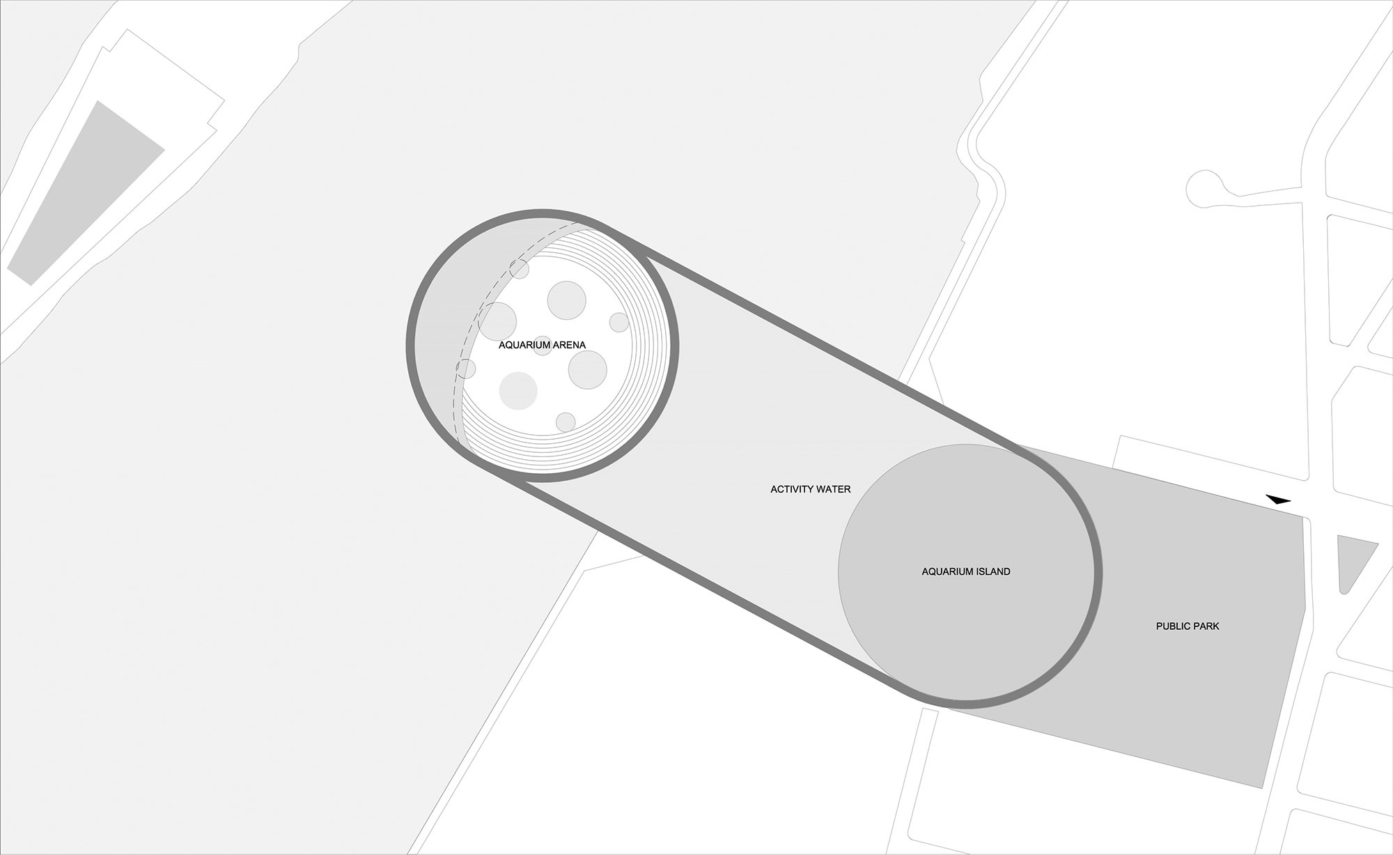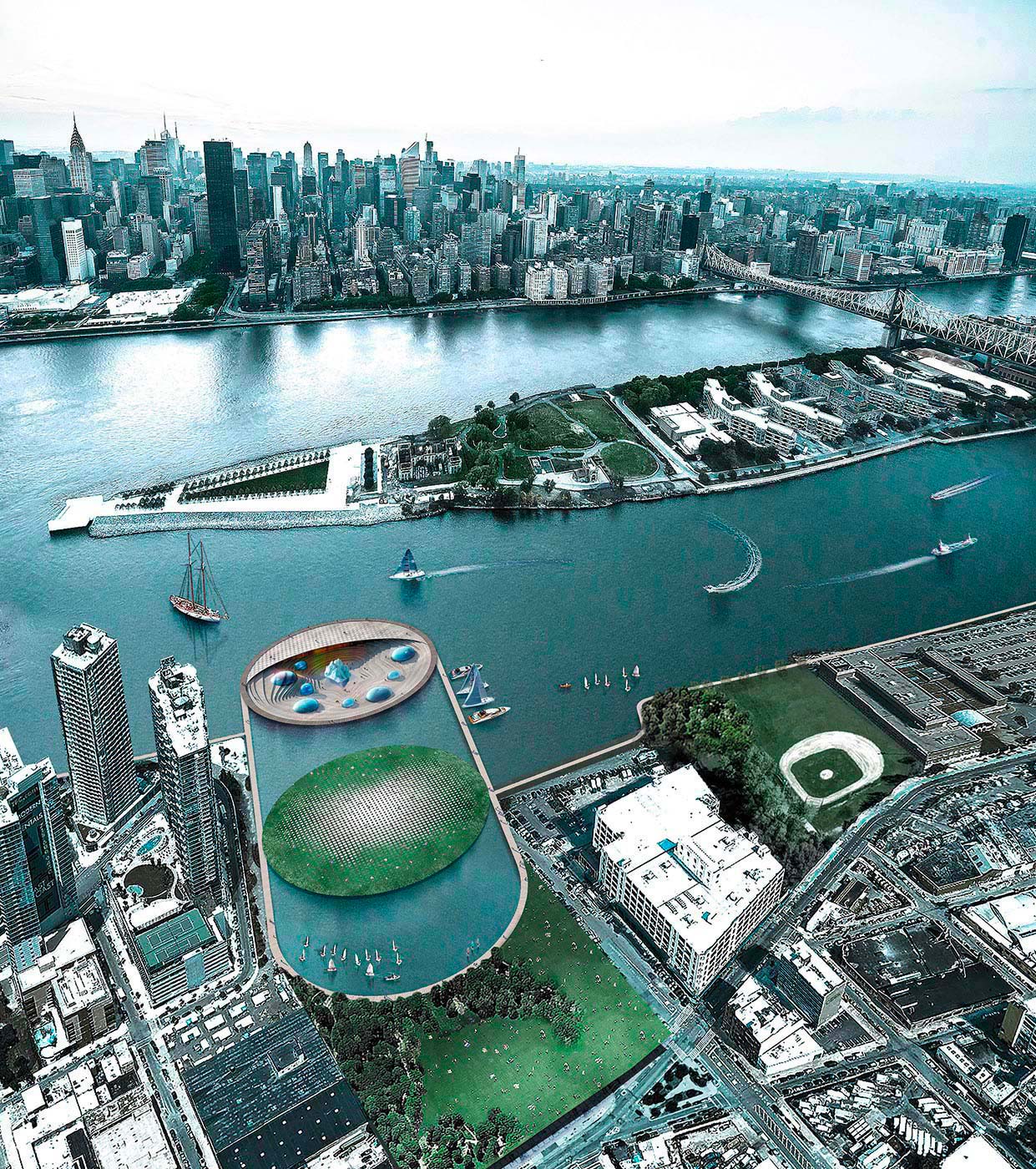 Occupying a total area of approximately 40,000 sqm on the East River, the architectural concept includes a large water basin with the aquarium and a marine centre located on a submerged, two-level island. A boardwalk surrounds the basin like a floating ring, creating a pathway linking the city and a new beach-themed public park to the aquarium.