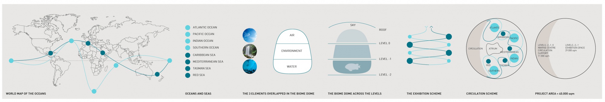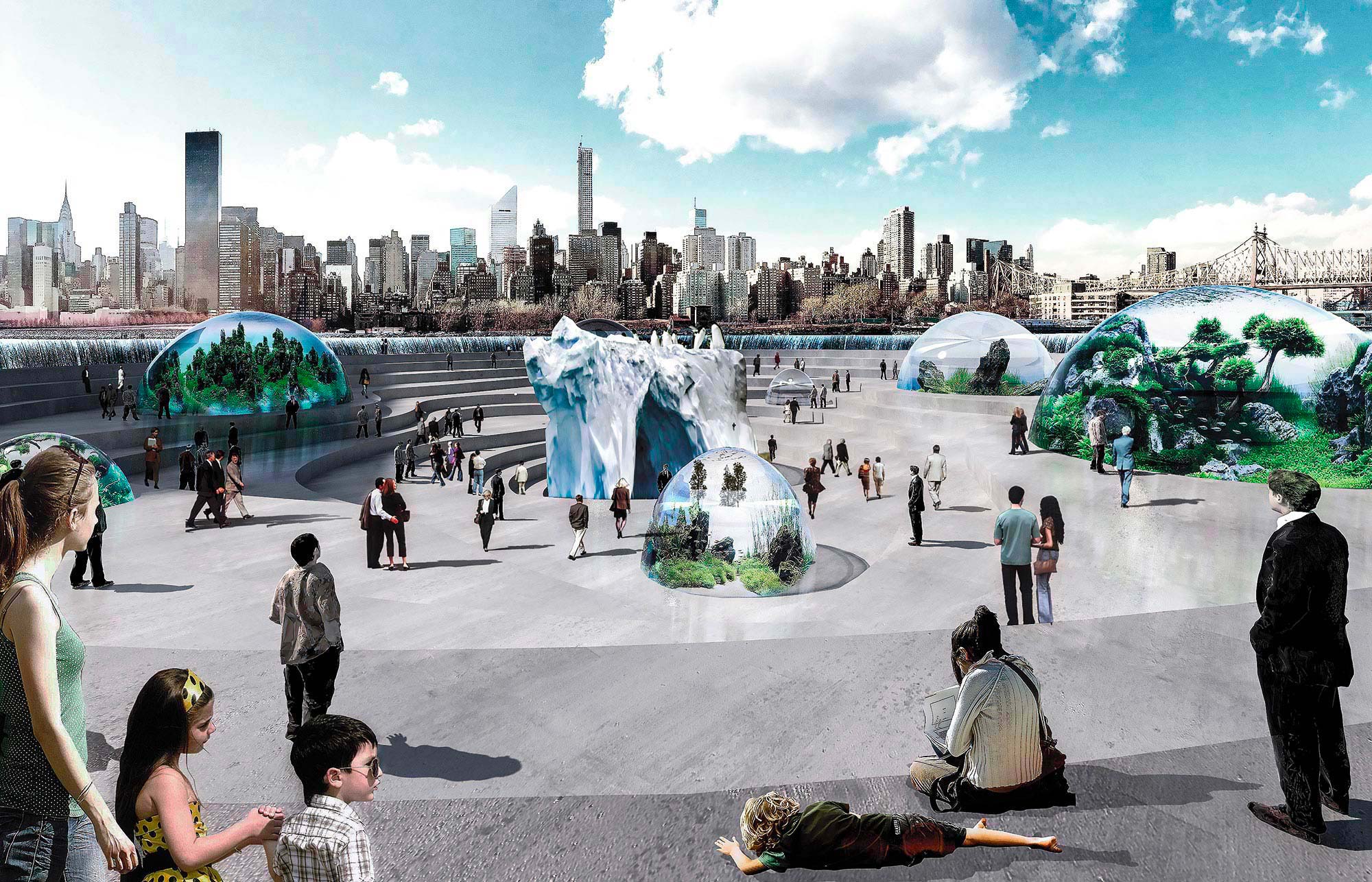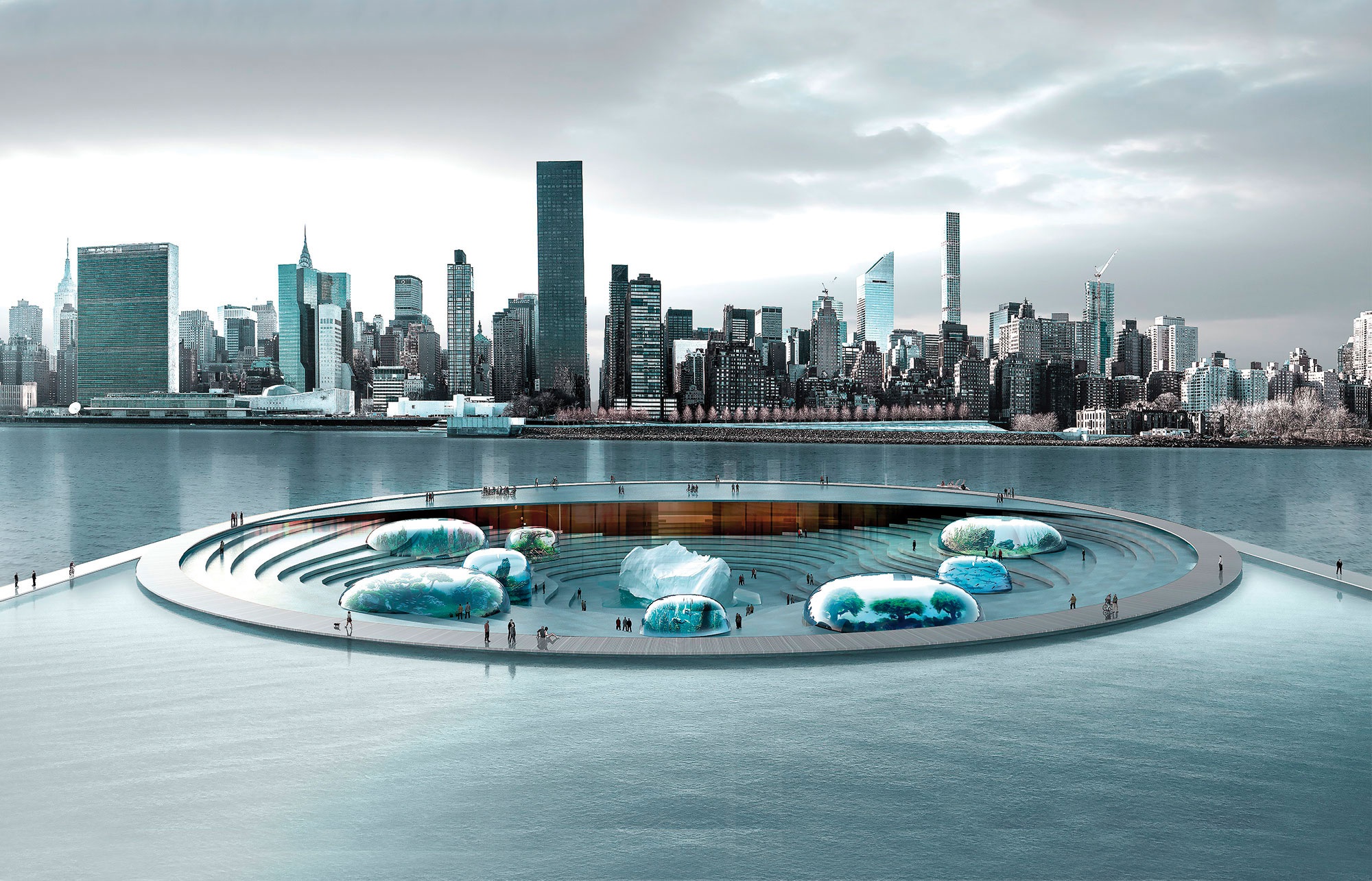 The aquarium itself would be formed of eight cylindrical transparent biodomes representing the four oceans and four seas, with the North and South Poles being expressed by an iceberg in the centre of the atrium.