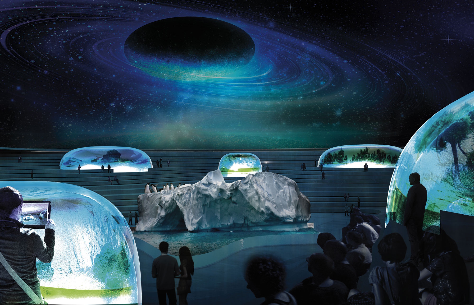 水族馆本身将由八个圆柱形透明生物穹顶组成,代表四大洋和四海,而北极和南极则由中庭中心的一座冰山表示。