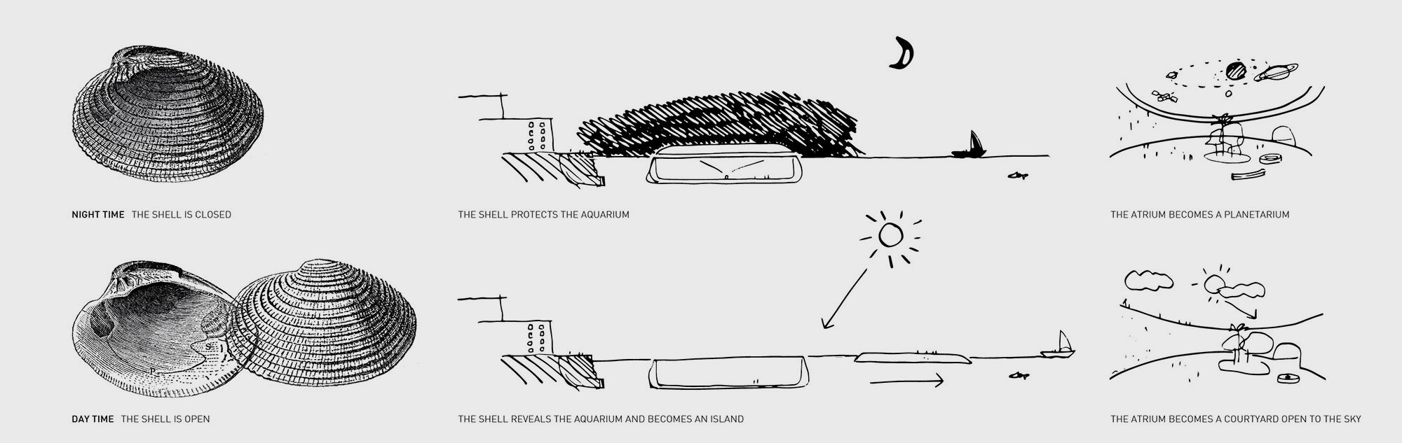 The main attraction, the aquarium, has a retractable roof enabling it to become a living shell that opens up to the sky during the day to reveal the sea worlds and closes as darkness falls to take on a 'second life' as a planetarium.